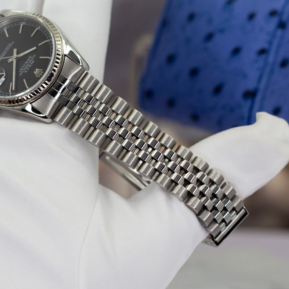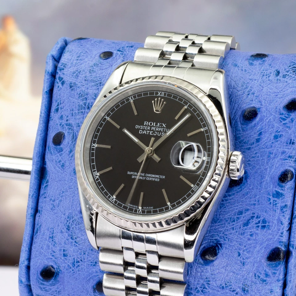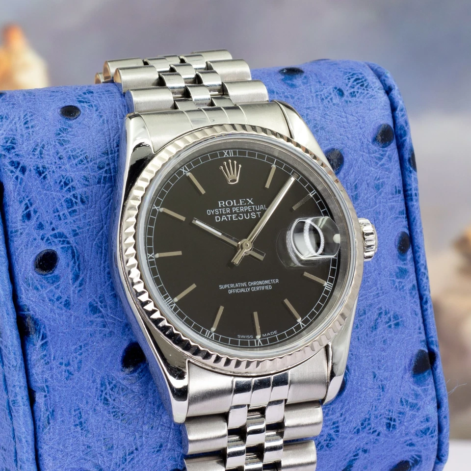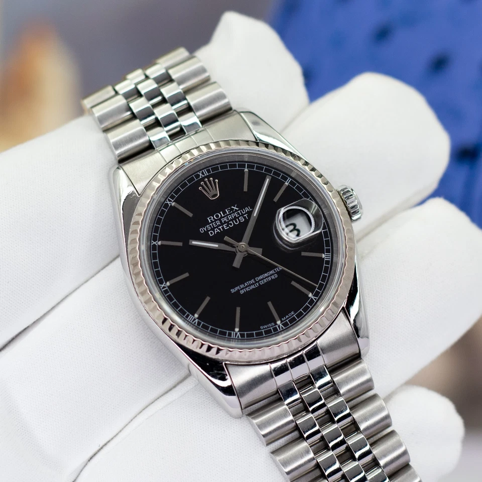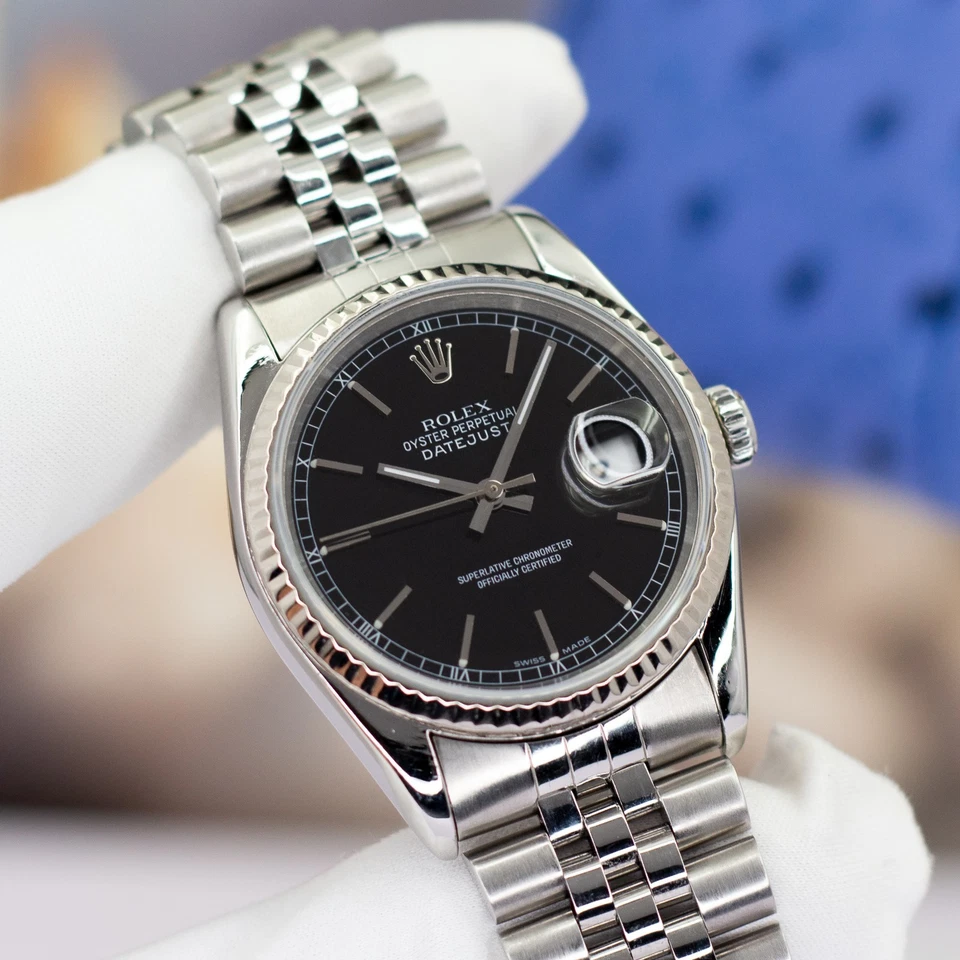 Available is a 1997 Rolex Datejust 16234 (U-serial) a reference that embodies the traditional Rolex design language: stainless steel, white-gold fluted bezel, and the versatile 36 mm Oyster profile. The black dial gives this example a sharper, more modern edge compared to the more common silver and champagne variants, making it a favorite among collectors seeking subtle presence with classic proportions.