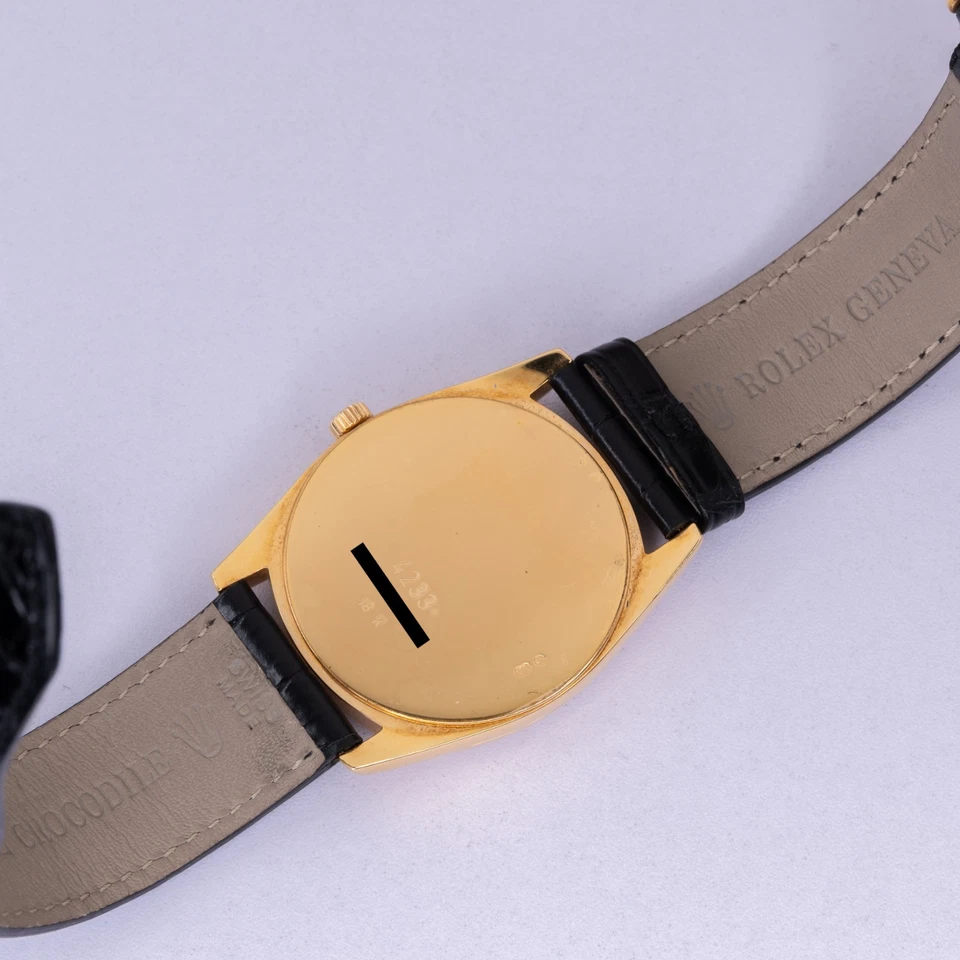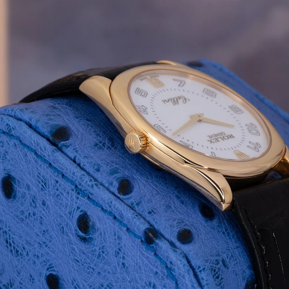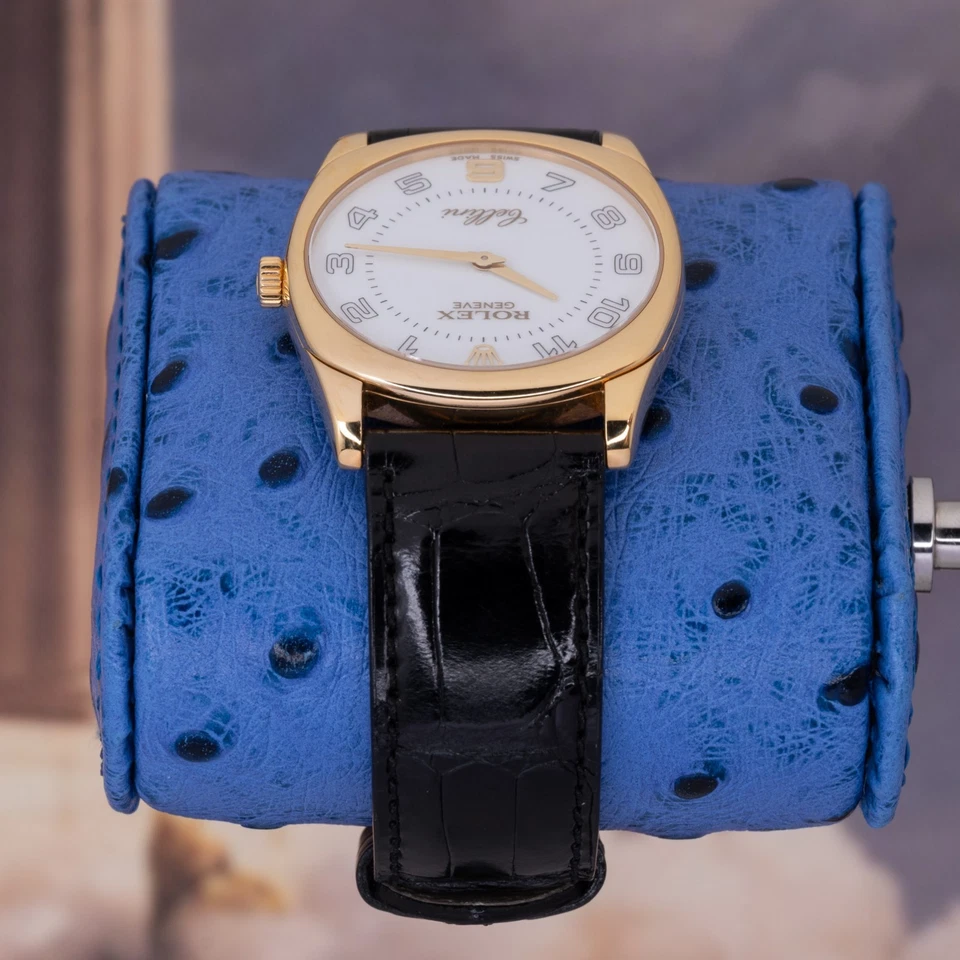 The solid 18K yellow-gold cushion-shaped case combines soft curvature with crisp definition, offering presence without excess. Paired with a traditional black leather strap, the watch wears with understated formality. The white dial is clean and highly legible, fitted with applied gold Arabic numerals and leaf-style hands that reinforce the Danaos’ classical intent. Power comes from a manual-wind Rolex caliber, delivering mechanical reliability without unnecessary complication exactly how a proper dress watch should behave.