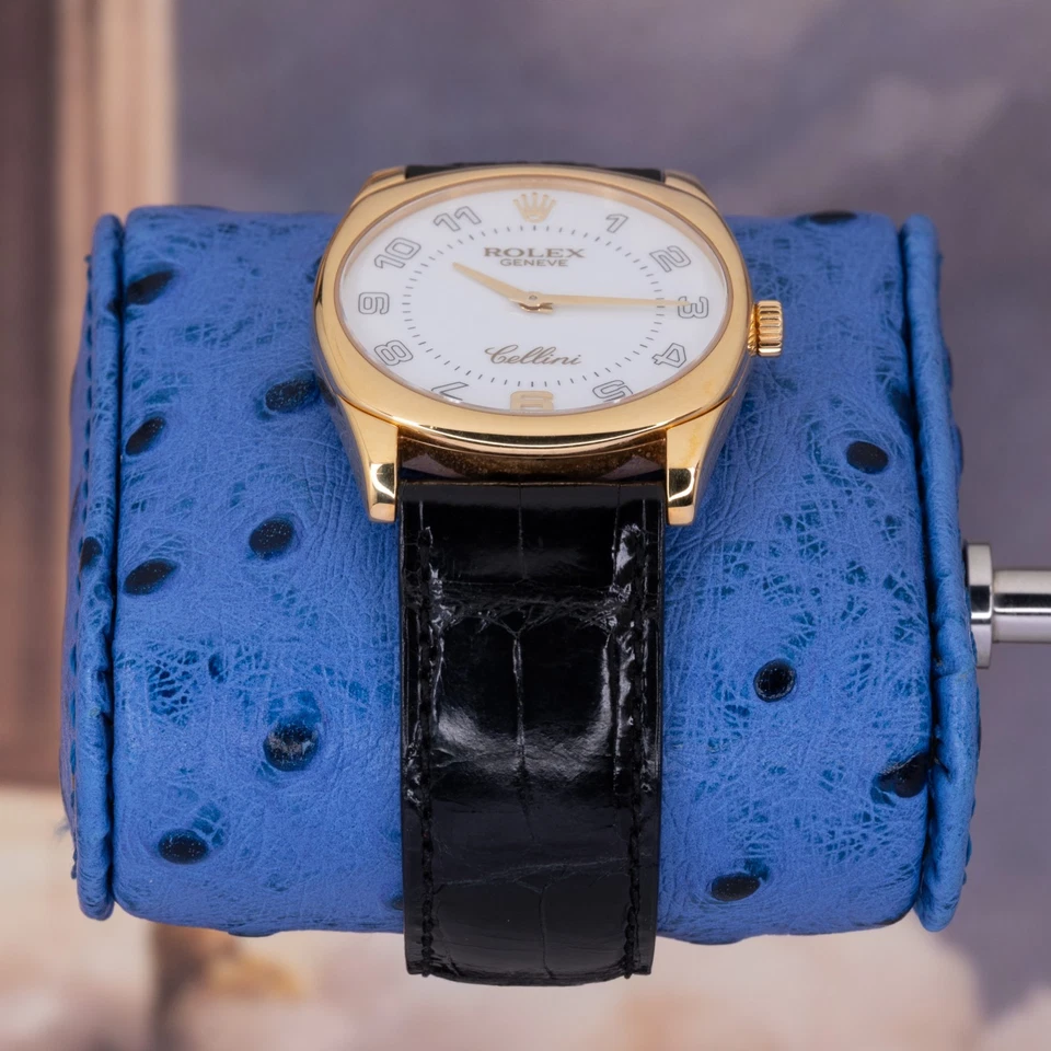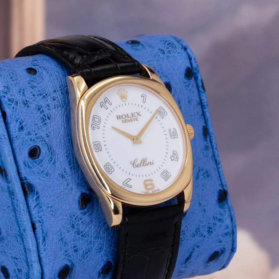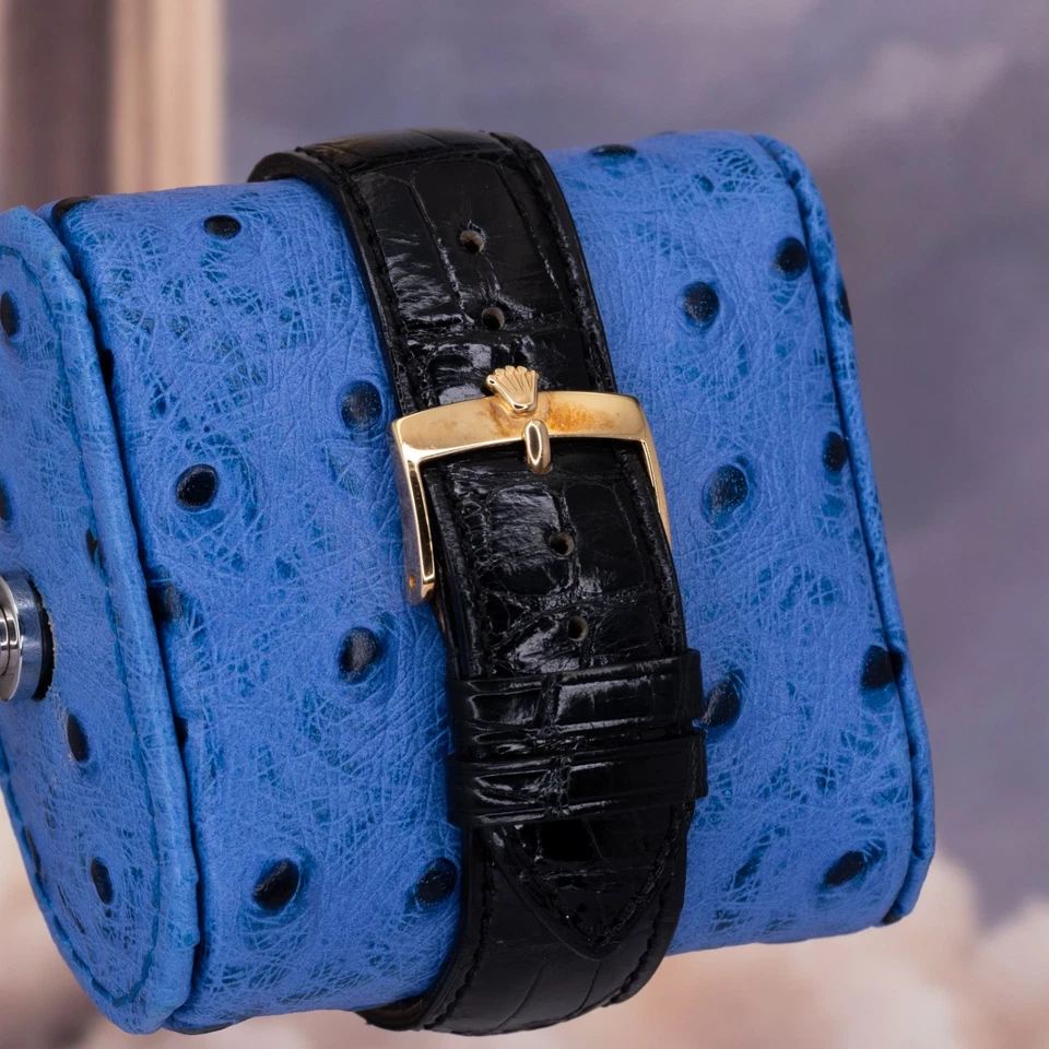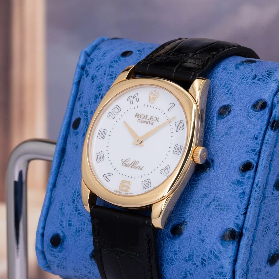 The solid 18K yellow-gold cushion-shaped case combines soft curvature with crisp definition, offering presence without excess. Paired with a traditional black leather strap, the watch wears with understated formality. The white dial is clean and highly legible, fitted with applied gold Arabic numerals and leaf-style hands that reinforce the Danaos’ classical intent. Power comes from a manual-wind Rolex caliber, delivering mechanical reliability without unnecessary complication exactly how a proper dress watch should behave.