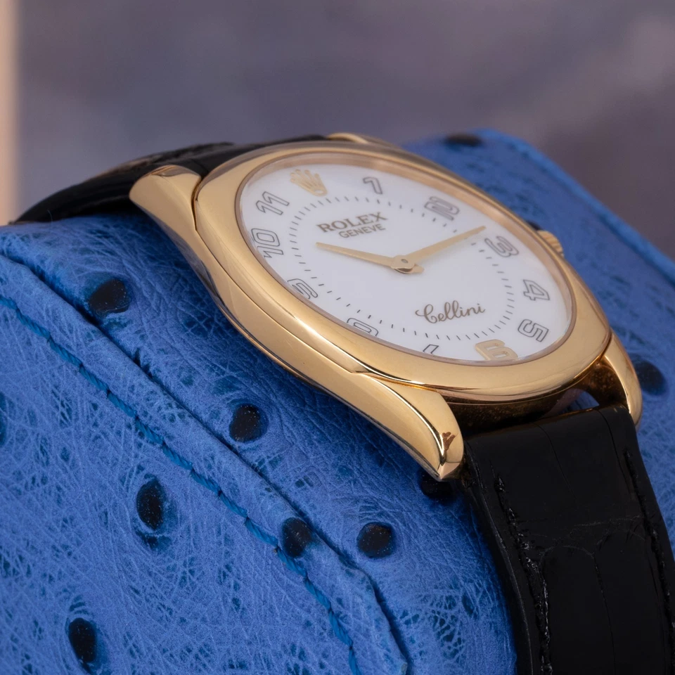 Available for acquisition is a 2006 Rolex Cellini Danaos, reference 4233a refined dress watch that reflects Rolex’s classical side: quiet confidence, precious metal, and disciplined design. The Danaos line stands apart from Rolex’s sport catalog, favoring elegant proportions and architectural case geometry over tool-watch bravado. This example, with its white dial and applied Arabic numerals, is among the more balanced and less commonly encountered configurations.