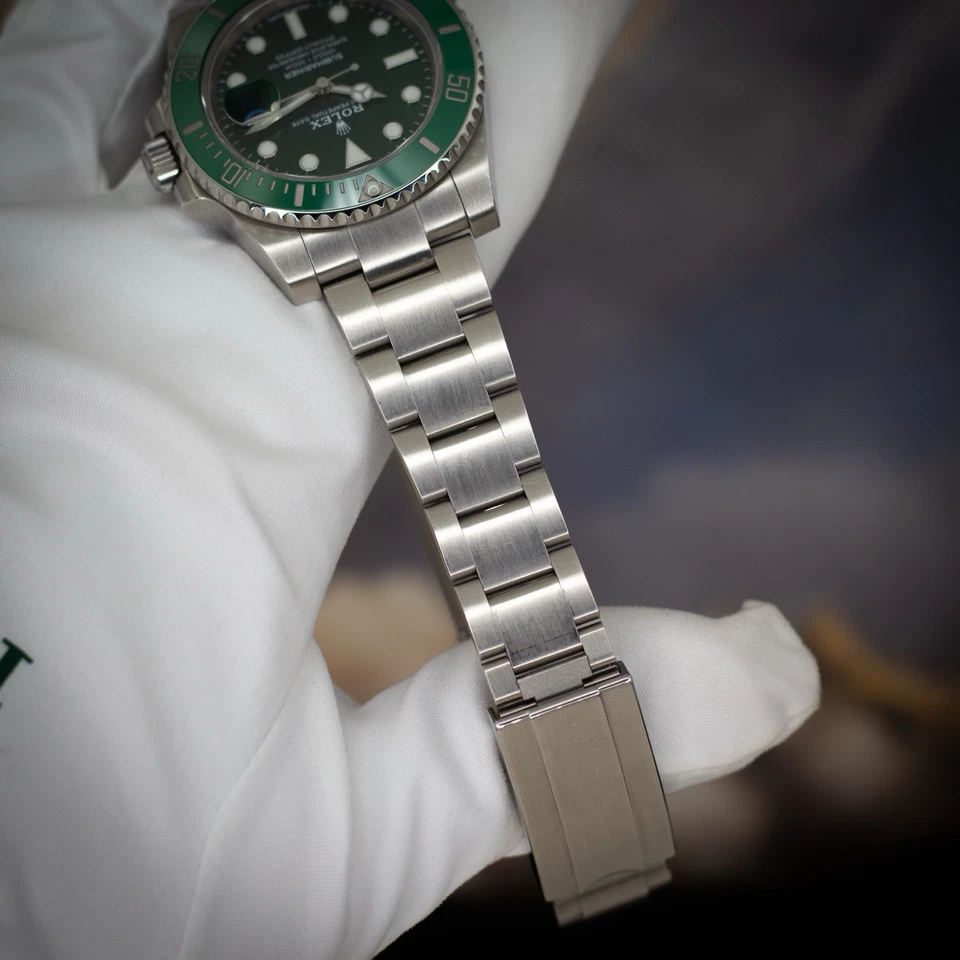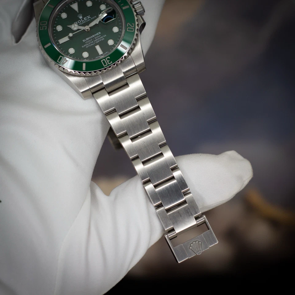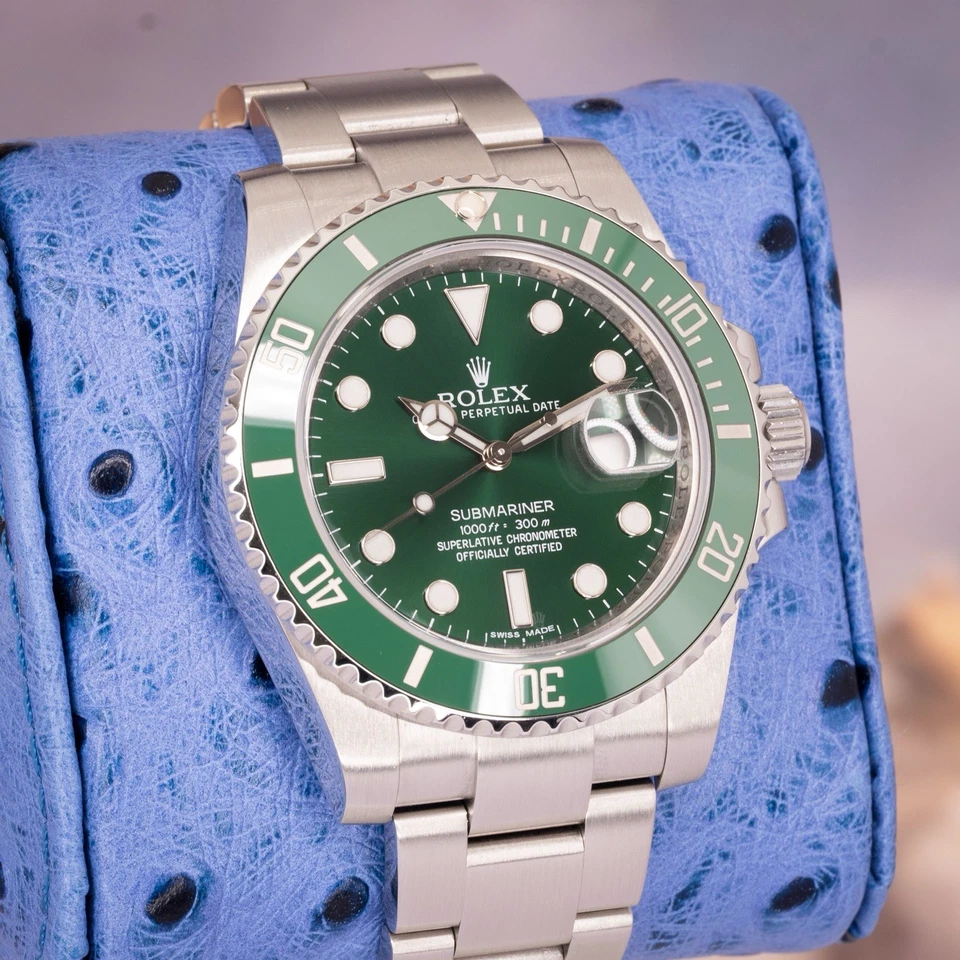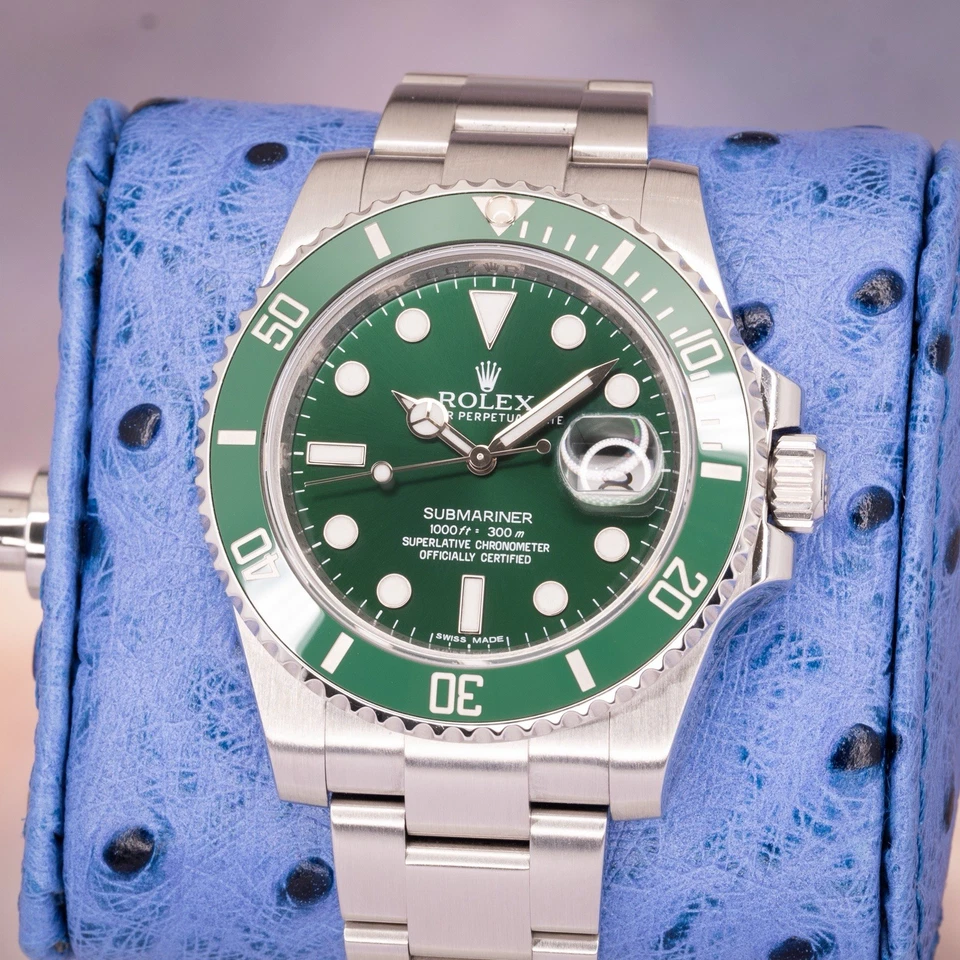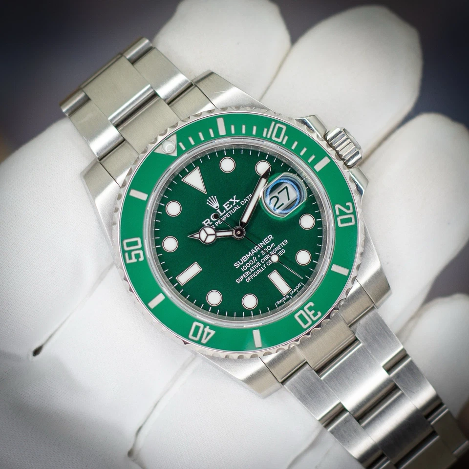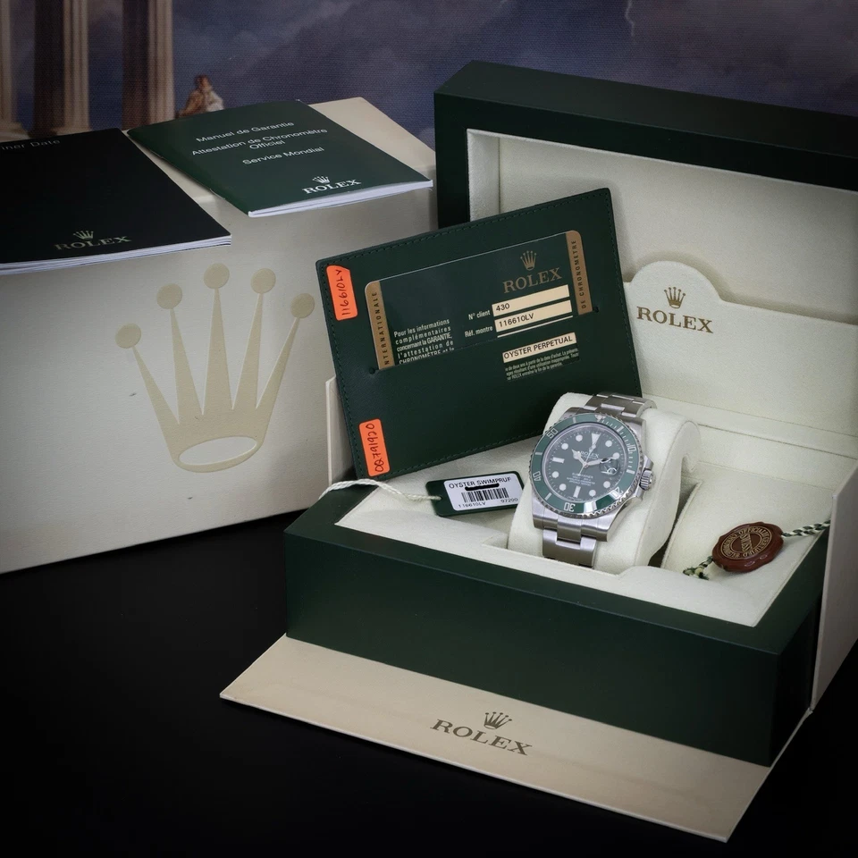 This example includes a complete 2012 full set: inner/outer Rolex boxes, warranty card, green serialized hang tag, Rolex chronometer hang tag, booklets, and card holder. Everything a serious collector expects from a strong Hulk set.