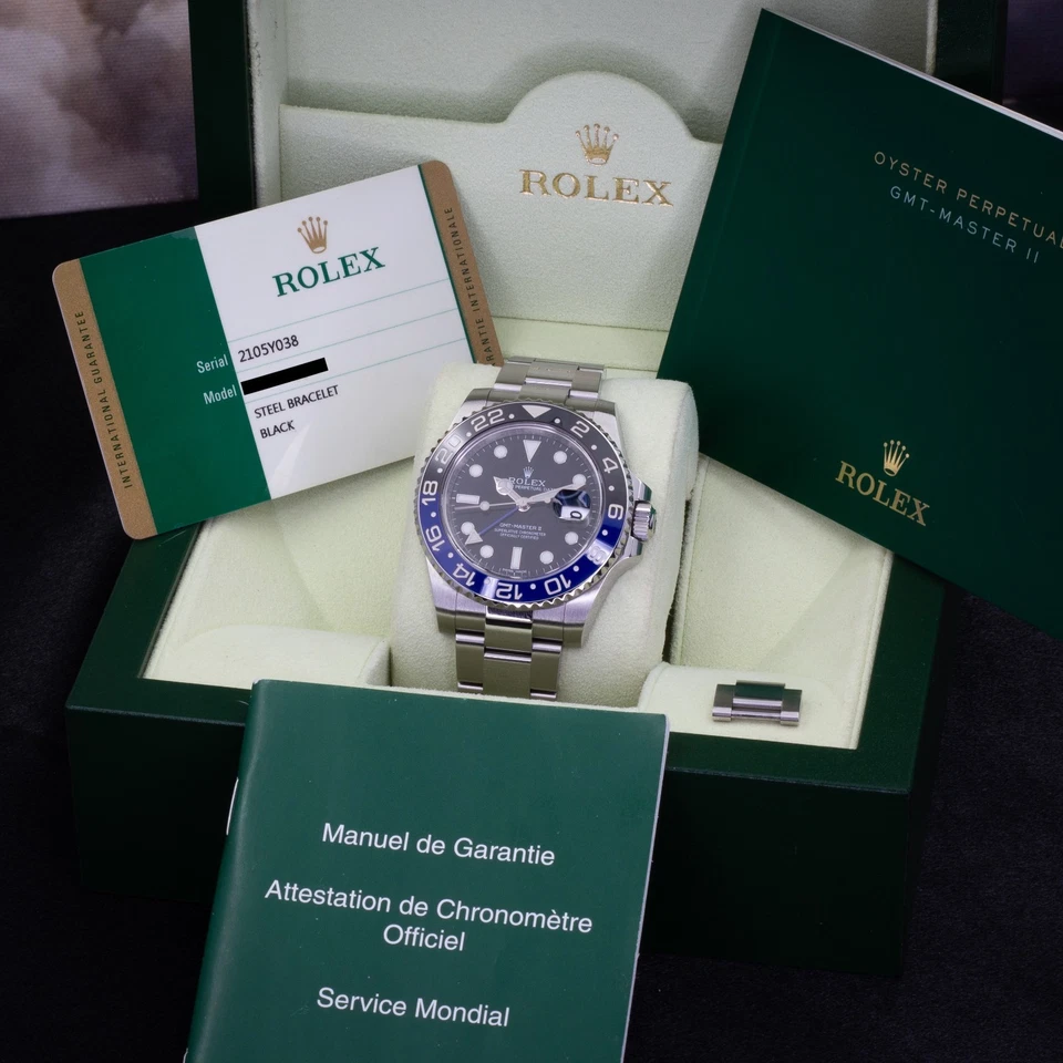 Included is the complete full set: inner and outer boxes, international warranty card dated January 2016, GMT-Master II manual, and chronometer certification booklet. A timeless and highly sought-after reference, the original “Batman” remains a standout in the modern Rolex sports collection for its transitional movement and unmistakable two-tone ceramic bezel.