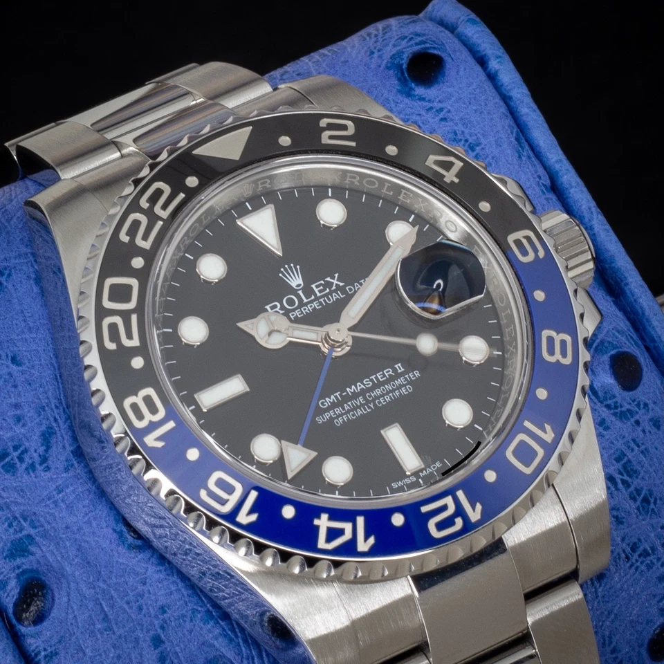 Available for purchase is a 2016 Rolex GMT-Master II “Batman”, reference 116710BLNR, showcasing the iconic black and blue Cerachrom ceramic bezel and black luminous dial. Released as the first bi-color ceramic bezel in Rolex’s history, the BLNR stands as a landmark model in the GMT-Master II lineage—balancing everyday versatility with professional dual-time functionality.