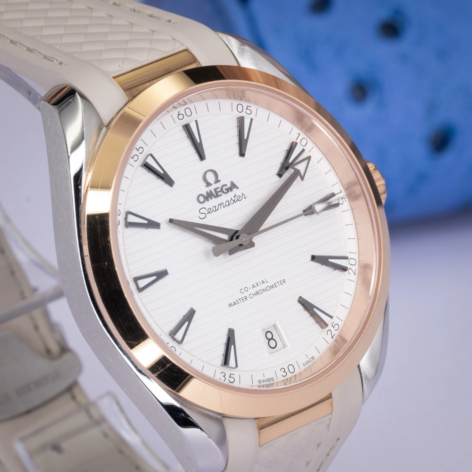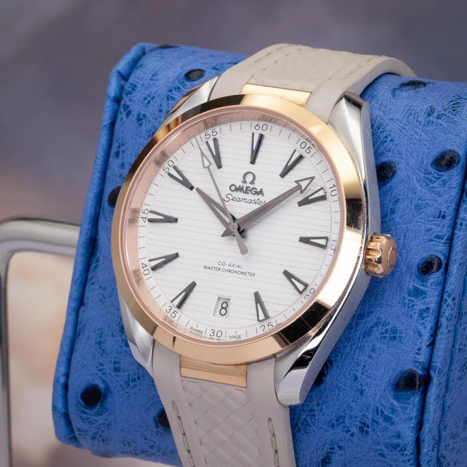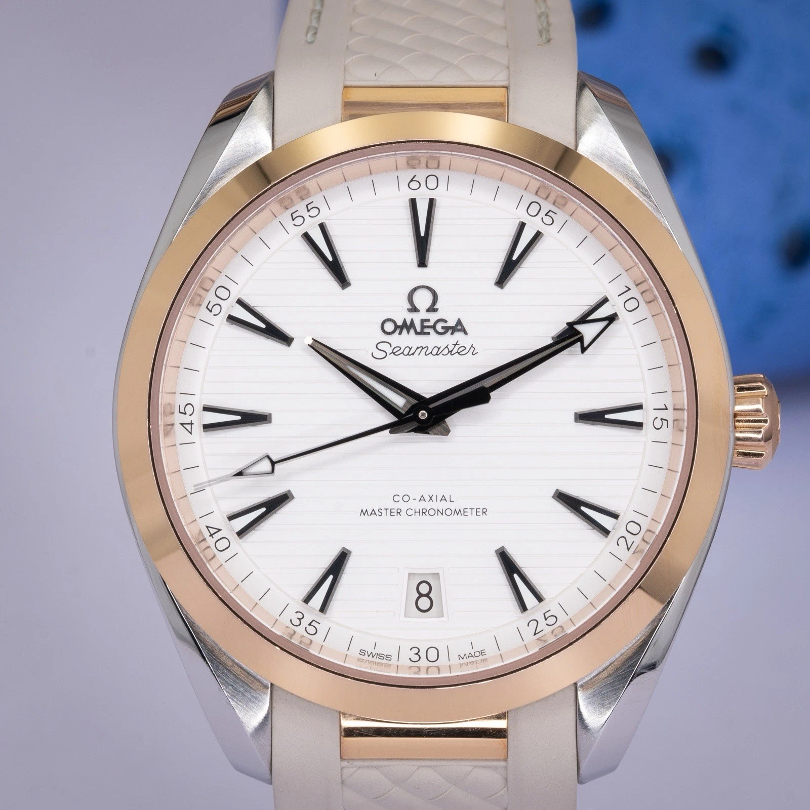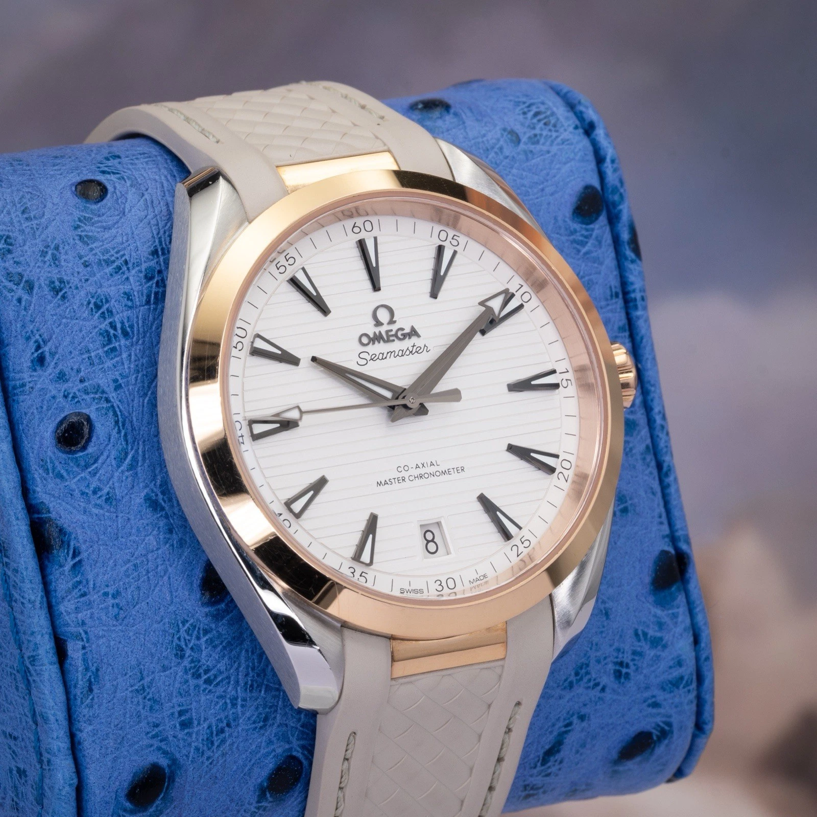 Offered here is a 2021 Omega Seamaster Aqua Terra, reference 220.22.41.21.02.001—one of the most balanced executions of Omega’s modern luxury-sport platform. The crisp white teak-pattern dial is paired with applied blackened indices and hands, framed by an 18K Sedna™ gold bezel that adds warmth without turning the watch flashy. It is restrained, technical, and unmistakably Aqua Terra.