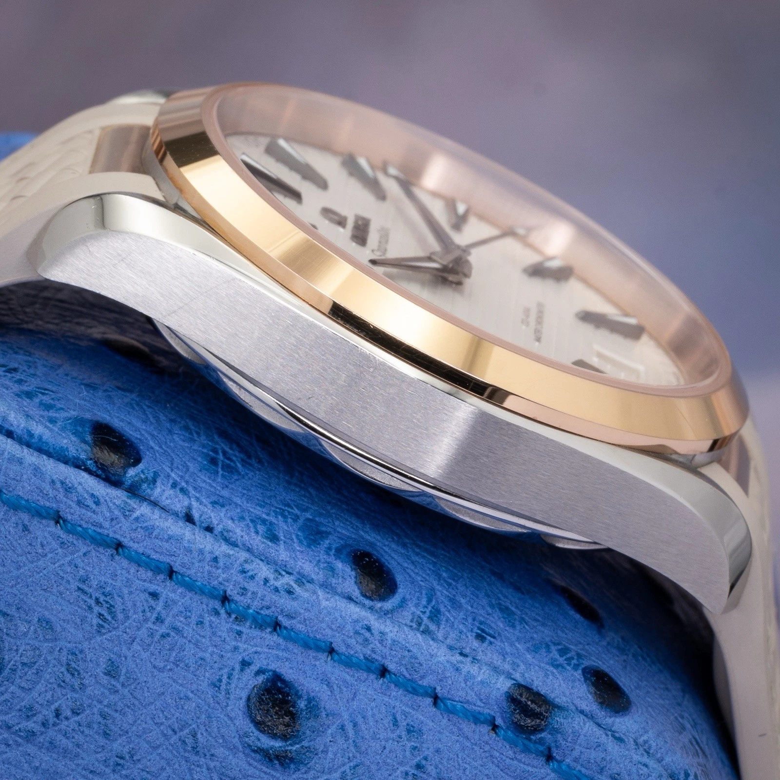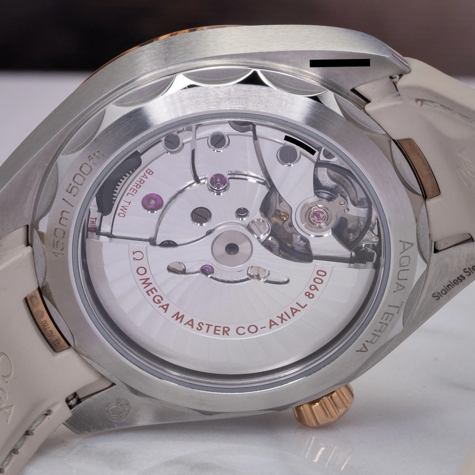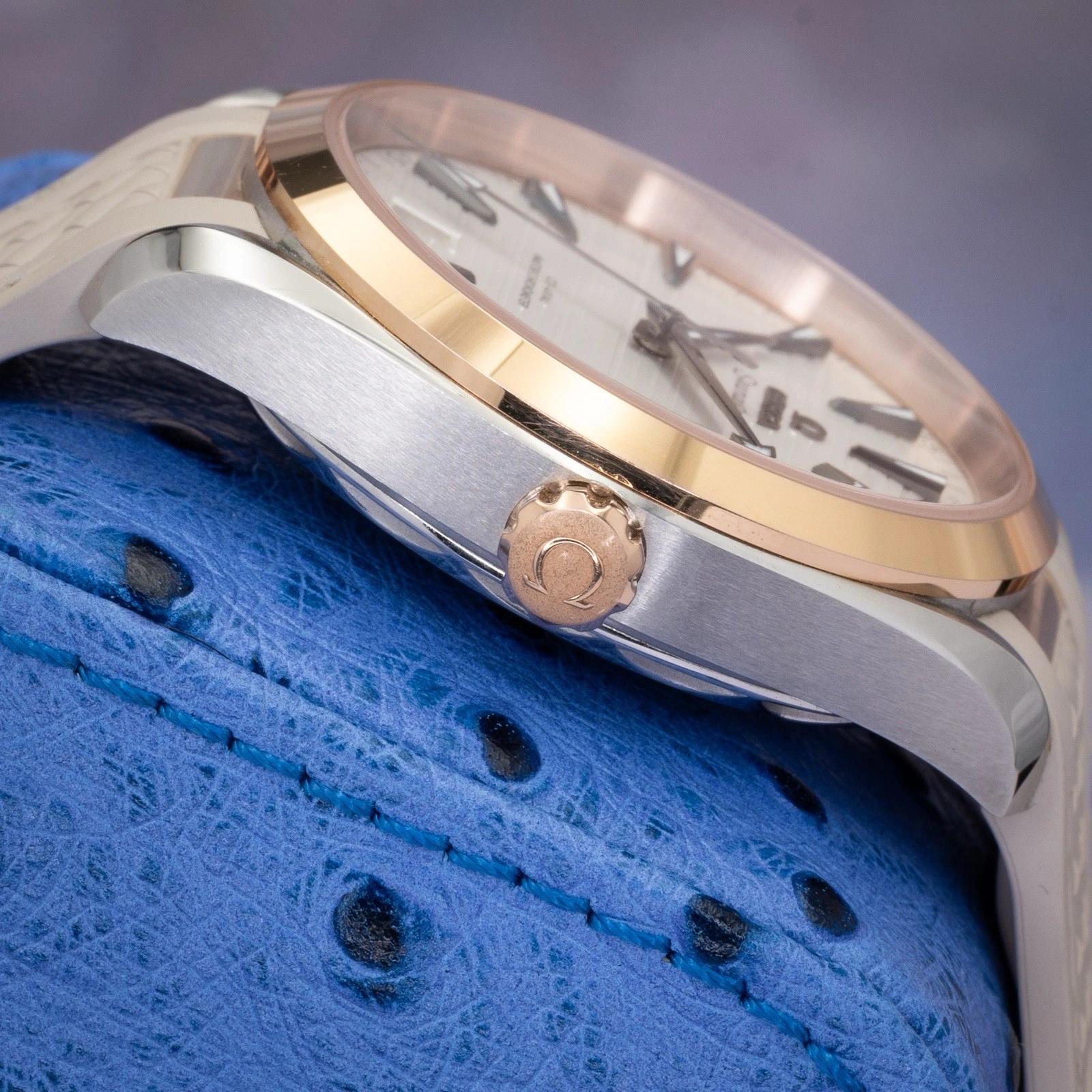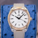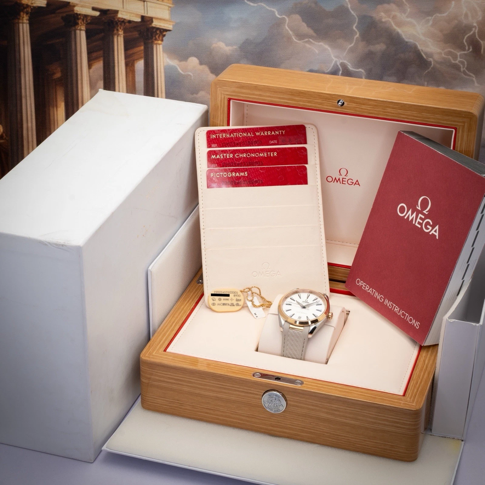 Offered here is a 2021 Omega Seamaster Aqua Terra, reference 220.22.41.21.02.001—one of the most balanced executions of Omega’s modern luxury-sport platform. The crisp white teak-pattern dial is paired with applied blackened indices and hands, framed by an 18K Sedna™ gold bezel that adds warmth without turning the watch flashy. It is restrained, technical, and unmistakably Aqua Terra.