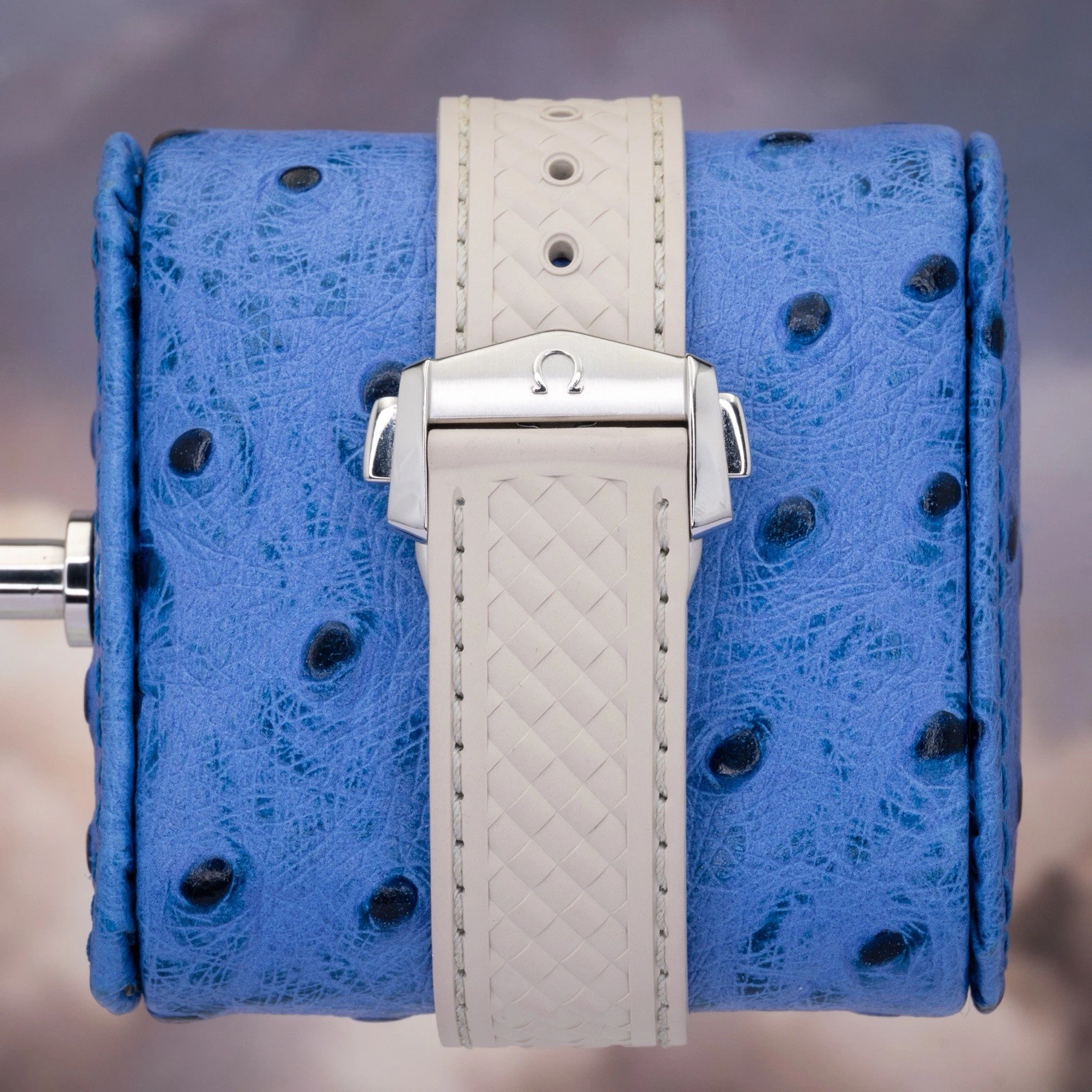 The 41mm stainless-steel case retains clean factory geometry and presents in excellent pre-owned condition, showing only light surface wear consistent with careful ownership. The white Omega rubber strap with Sedna™ gold accents reinforces the model’s versatility—comfortable, secure, and equally appropriate under a cuff or worn casually.