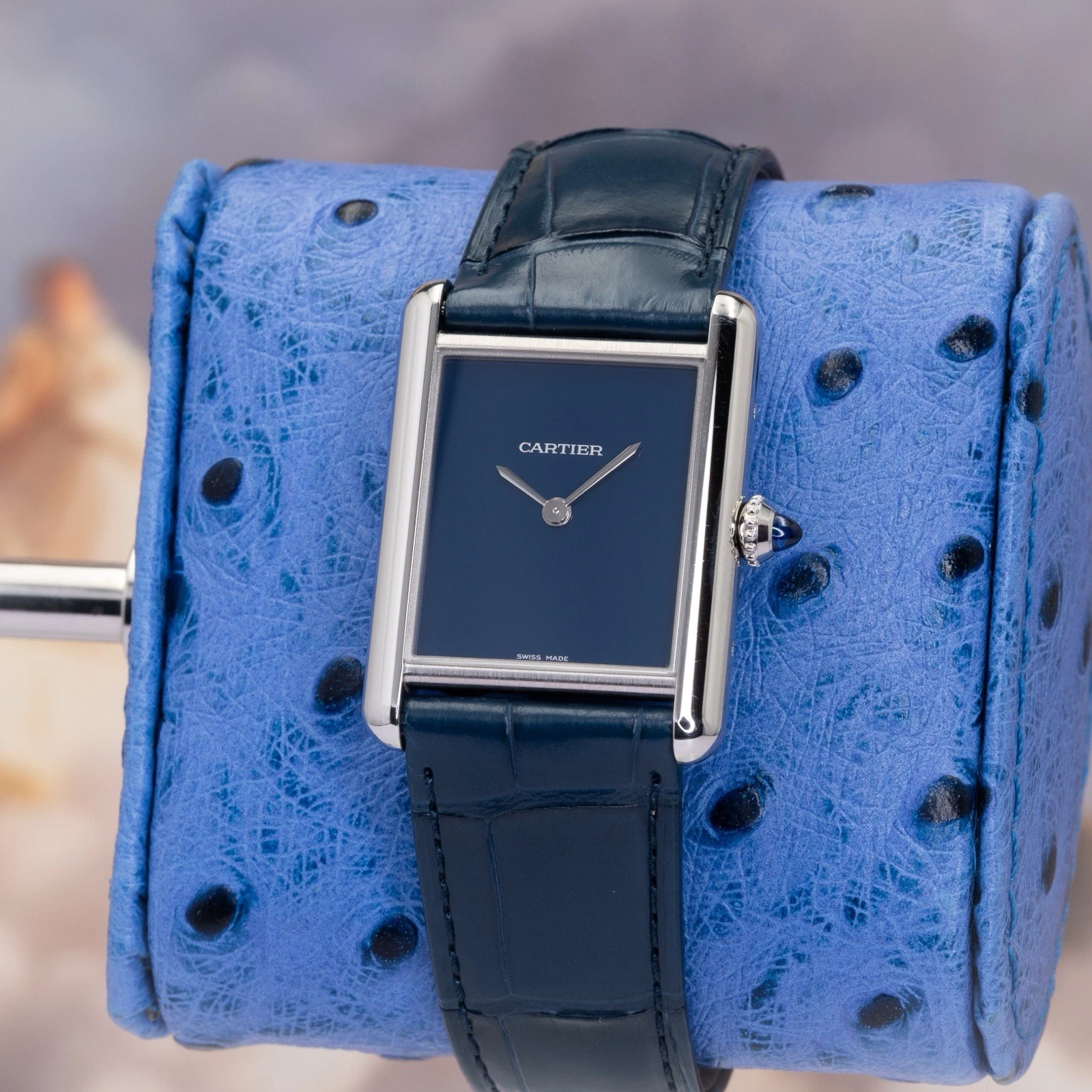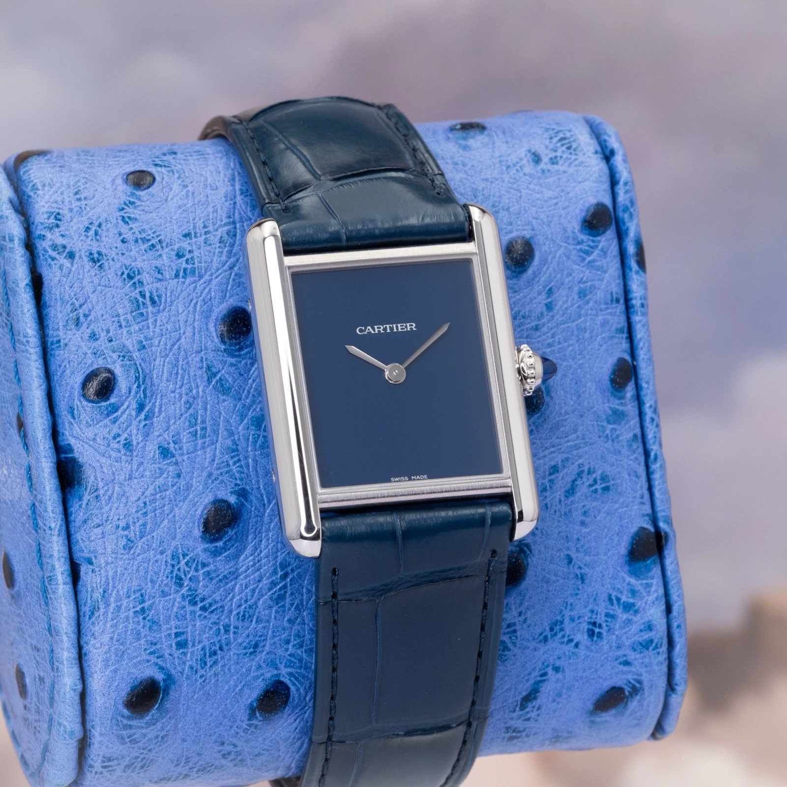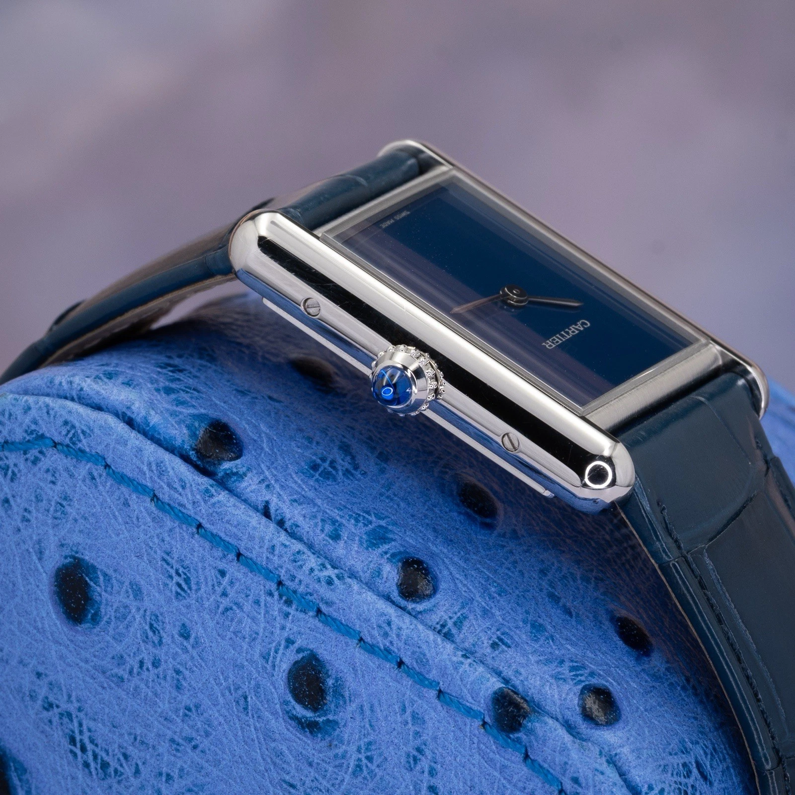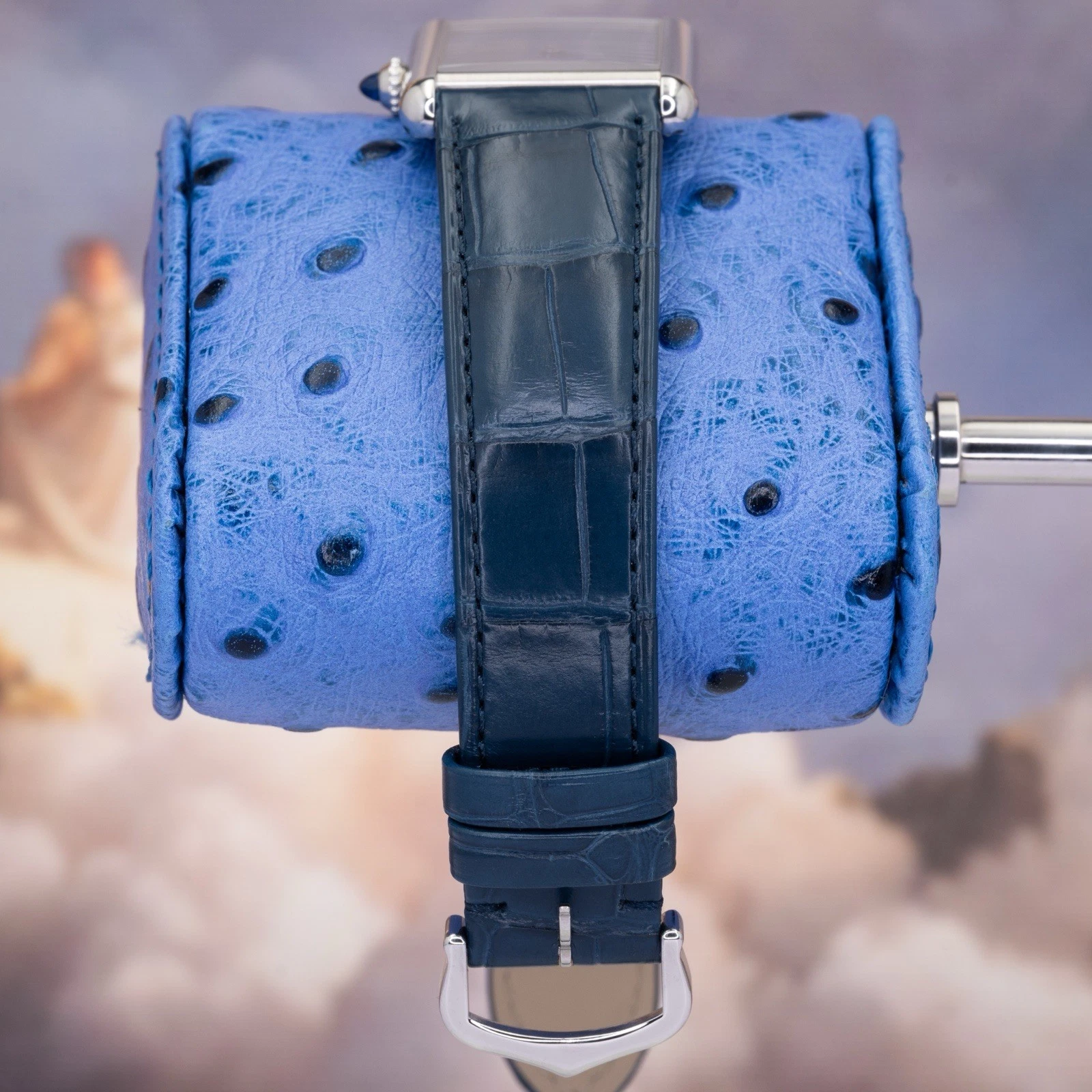 The polished stainless-steel case presents crisp and clean, showing only minimal, honest wear consistent with careful ownership. The slim profile sits effortlessly on the wrist, equally appropriate with a suit or worn casually. Paired with a matching blue alligator-pattern leather strap and Cartier’s signature cabochon crown, the watch delivers understated elegance without theatrics.