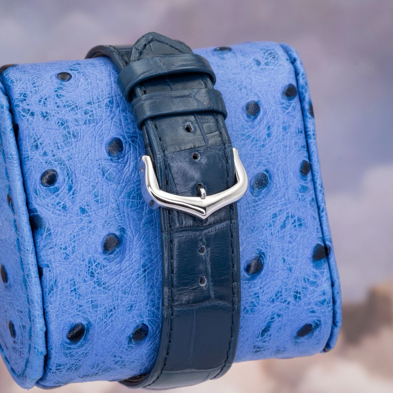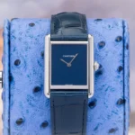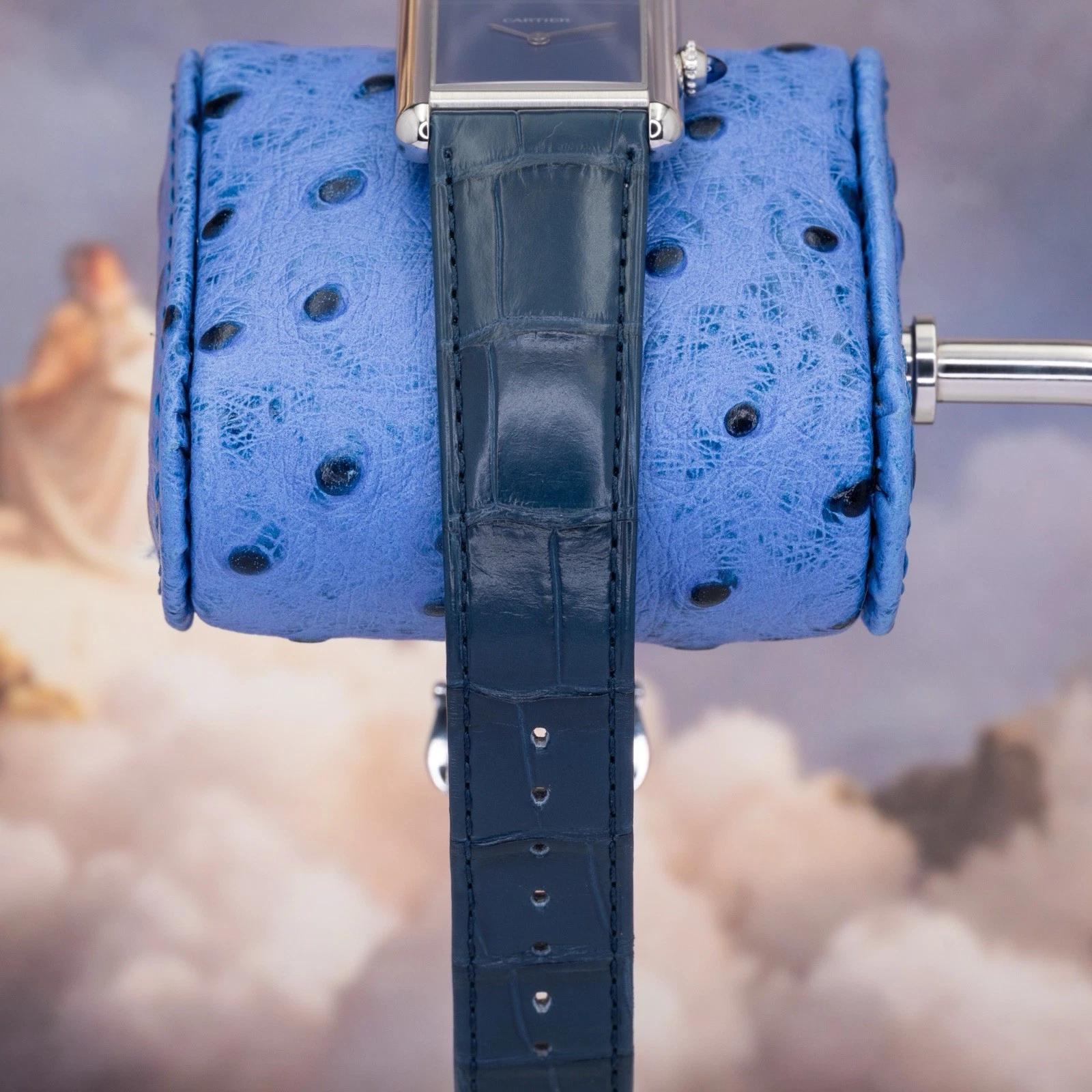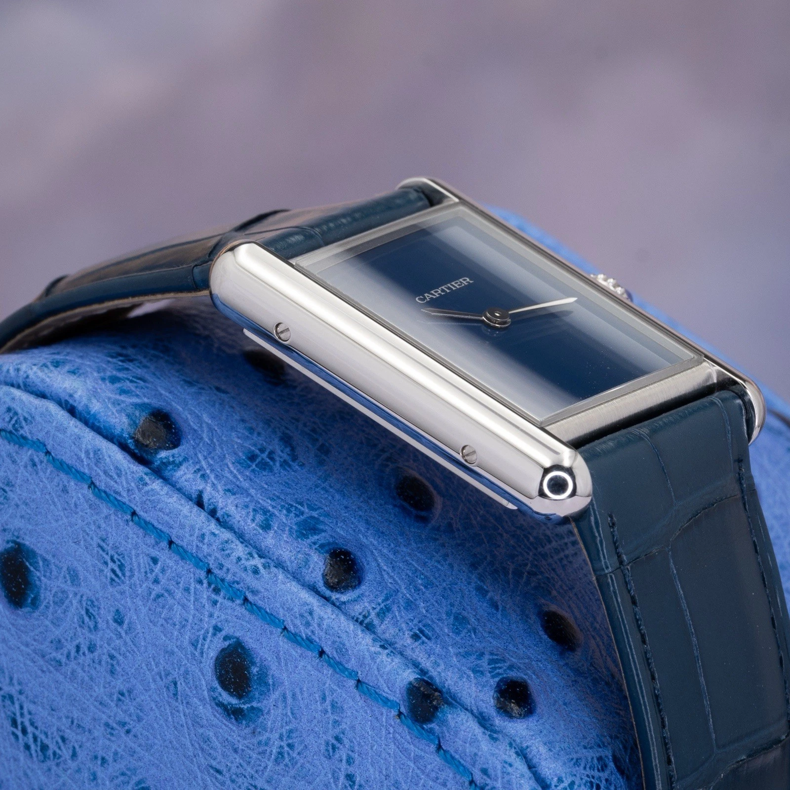 The polished stainless-steel case presents crisp and clean, showing only minimal, honest wear consistent with careful ownership. The slim profile sits effortlessly on the wrist, equally appropriate with a suit or worn casually. Paired with a matching blue alligator-pattern leather strap and Cartier’s signature cabochon crown, the watch delivers understated elegance without theatrics.
