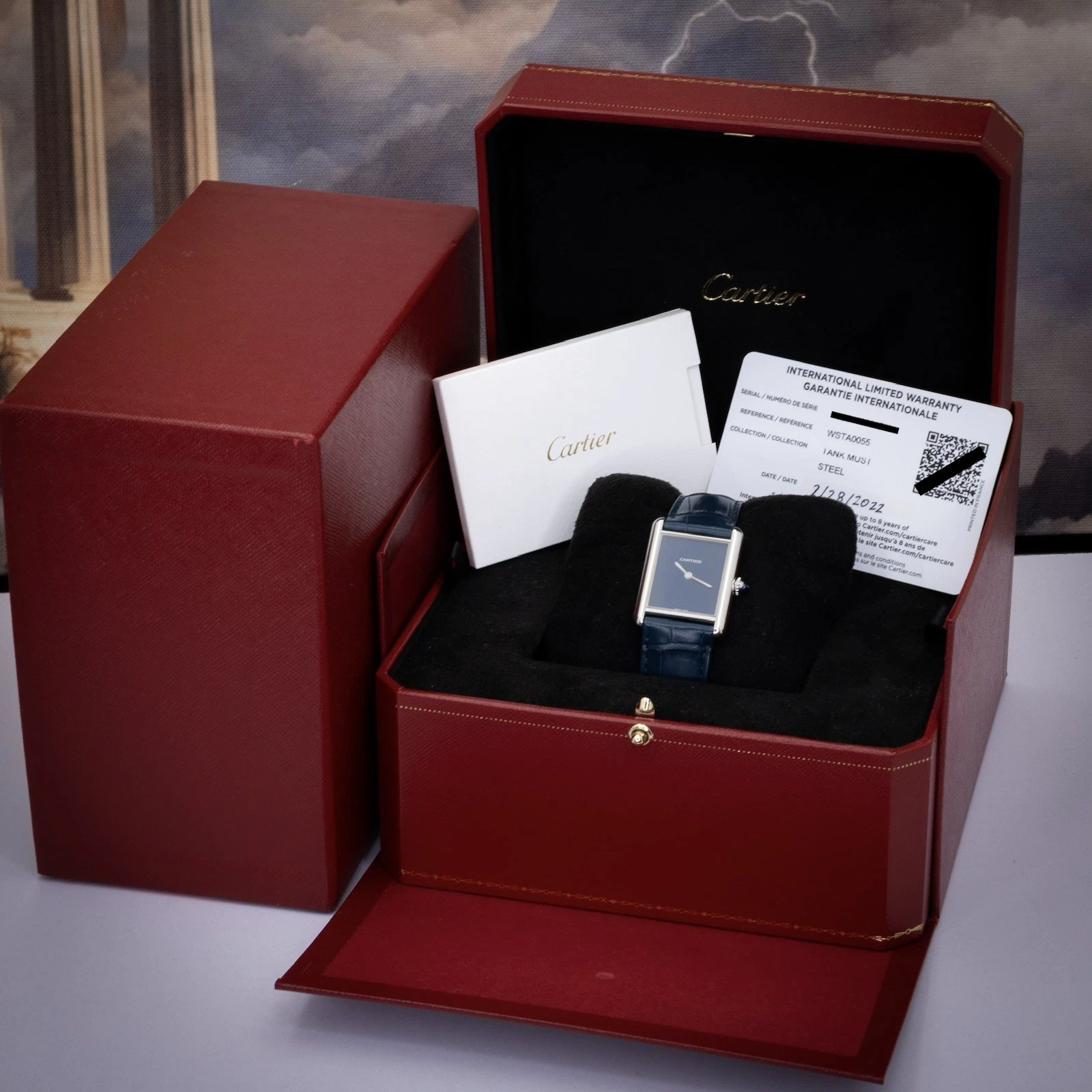 2022 Cartier Tank Must WSTA0055 Blue Dial Large Full Set Quartz Steel Alligator