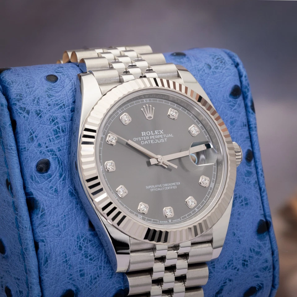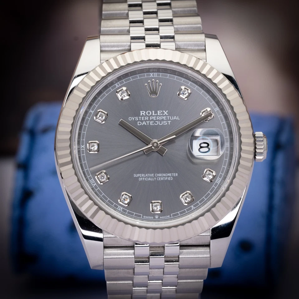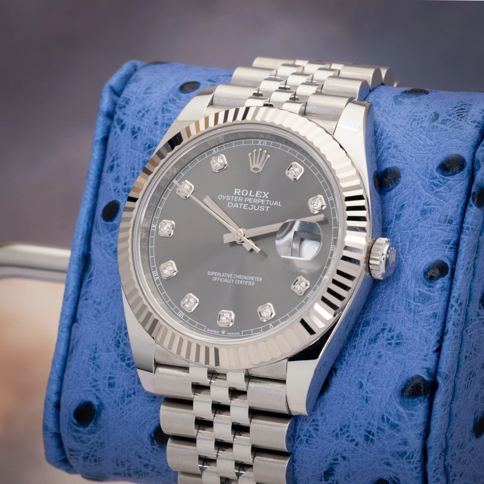 The 2023 Rolex Datejust 41 (ref. 126334) represents one of the most desirable modern configurations in the Datejust lineup: the slate-grey sunburst dial set with factory diamonds. The white-gold fluted bezel frames the dial with unmistakable Rolex character, while the 41mm Oystersteel case delivers the modern wrist presence collectors expect.