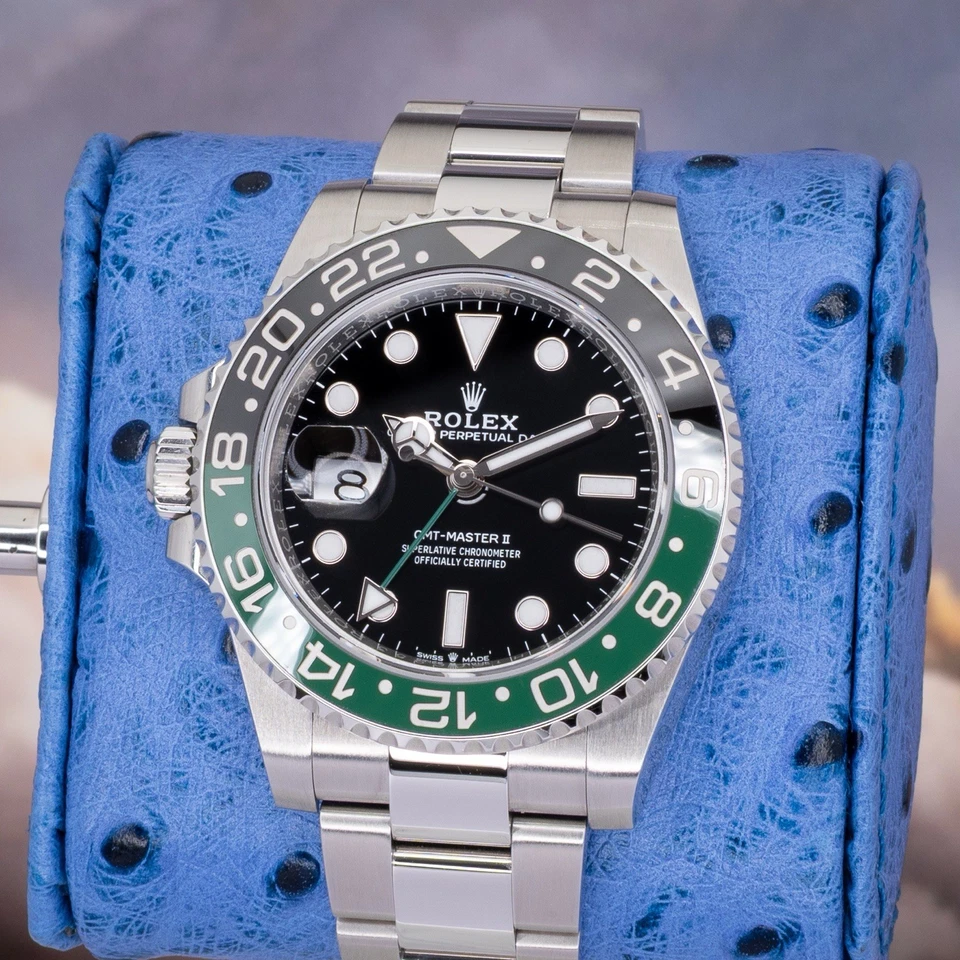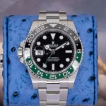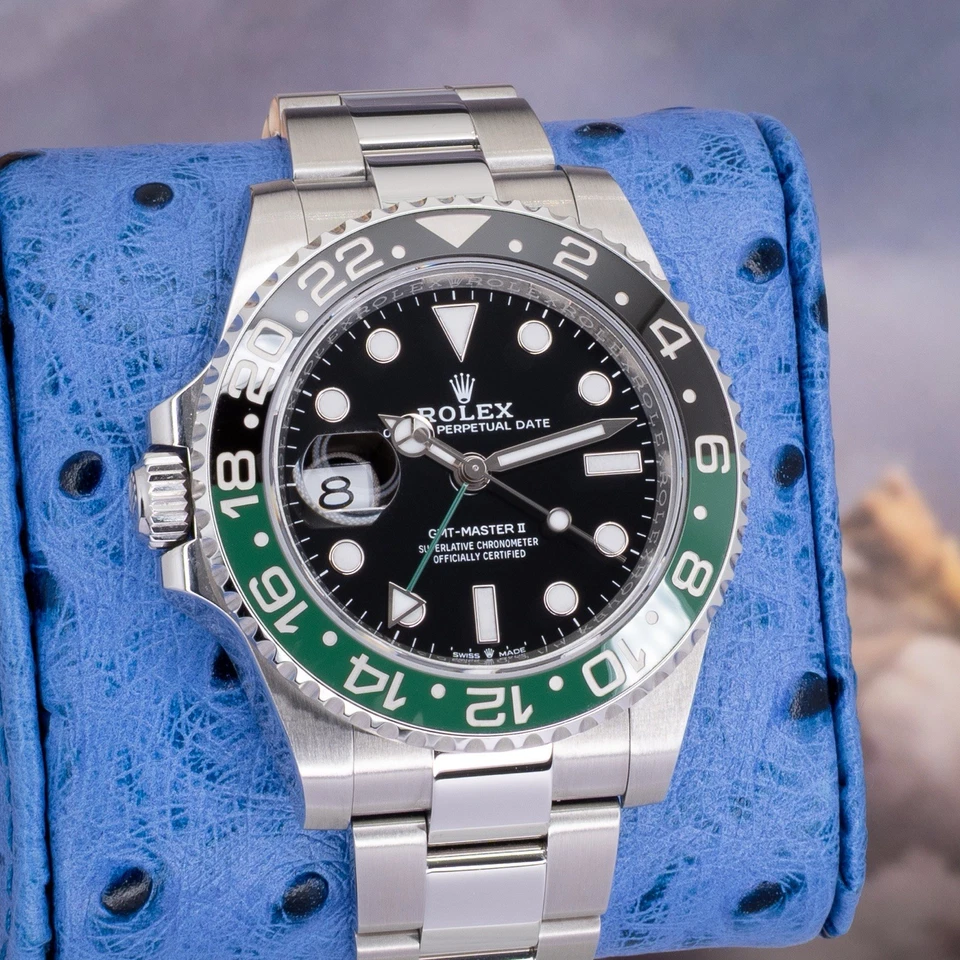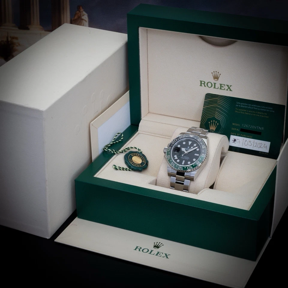 The 2024 Rolex GMT-Master II ref. 126720VTNR represents one of the most unconventional and sought-after configurations in the modern Rolex lineup. Nicknamed the “Sprite,” this model features the left-hand crown placement, a design rarely seen in Rolex’s GMT catalog and instantly recognizable to collectors. The black-and-green Cerachrom insert provides a sharp, modern contrast, while maintaining the classic dual-time functionality that established the GMT-Master’s legacy.