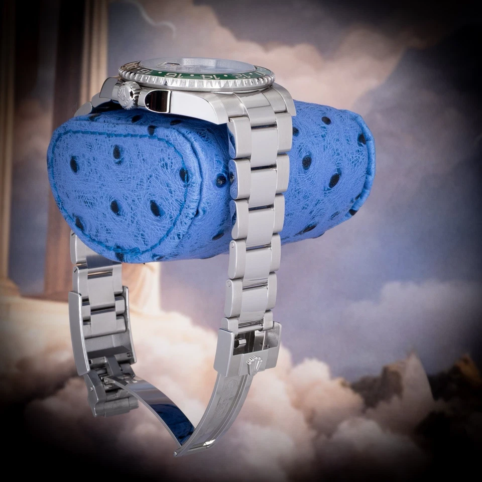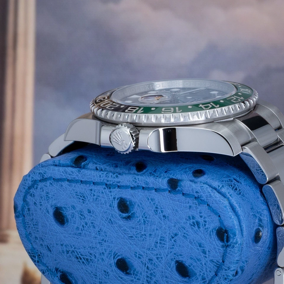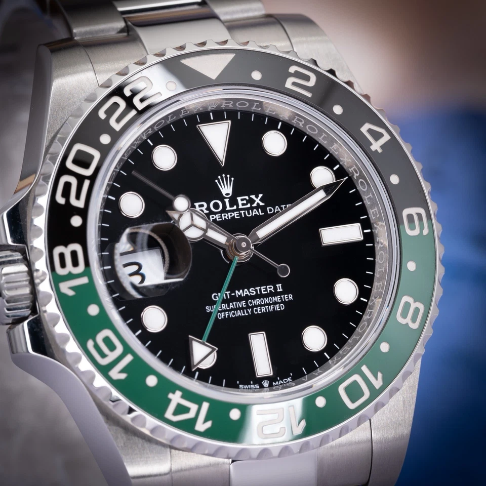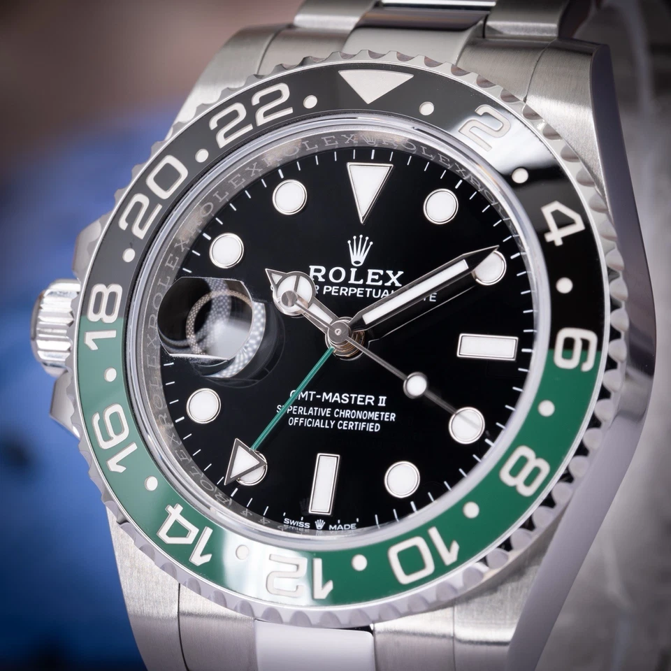 The 2024 Rolex GMT-Master II ref. 126720VTNR represents one of the most unconventional and sought-after configurations in the modern Rolex lineup. Nicknamed the “Sprite,” this model features the left-hand crown placement, a design rarely seen in Rolex’s GMT catalog and instantly recognizable to collectors. The black-and-green Cerachrom insert provides a sharp, modern contrast, while maintaining the classic dual-time functionality that established the GMT-Master’s legacy.