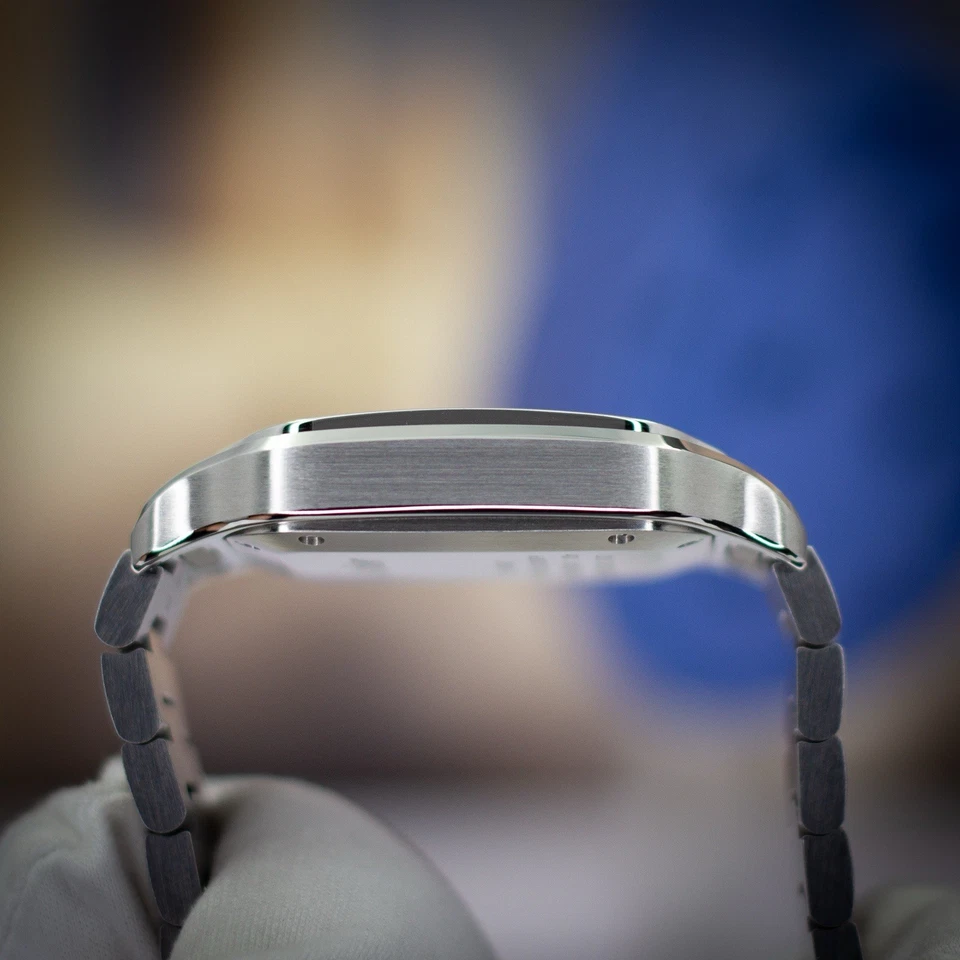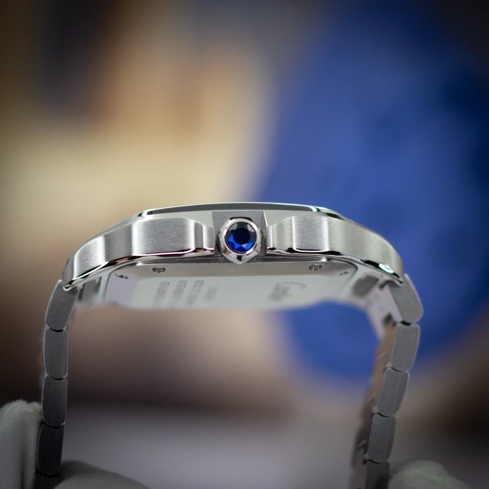 The 2025 Cartier Santos de Cartier Medium (35mm) ref. WSSA0063 represents the purest expression of the modern Santos platform balanced proportions, elegant case architecture, and Cartier’s unmistakable design lineage reaching back to 1904. The stainless-steel case carries Cartier’s traditional brushed surfaces framed by polished bevels, punctuated by the signature exposed-screw bezel that defines the Santos silhouette.