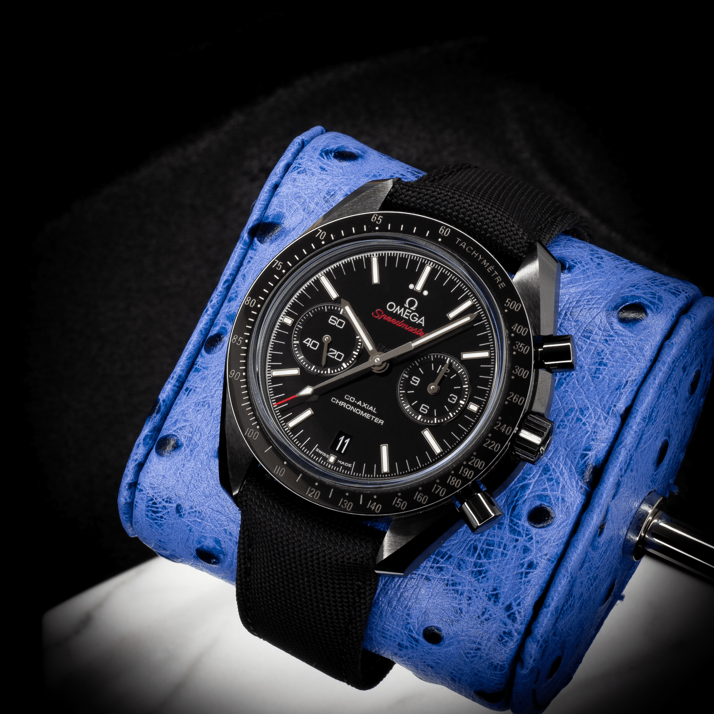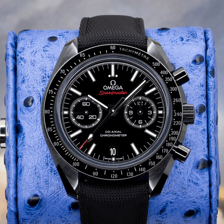 Inside, the watch houses Omega’s in-house Co-Axial Caliber 9300 automatic chronograph movement, visible through the sapphire crystal exhibition caseback. The black dial, paired with luminous indices and dual-register layout, delivers a sleek, stealth aesthetic with excellent legibility. A modern reinterpretation of the Moonwatch, this model is both a collector’s centerpiece and a versatile daily wearer.
