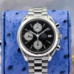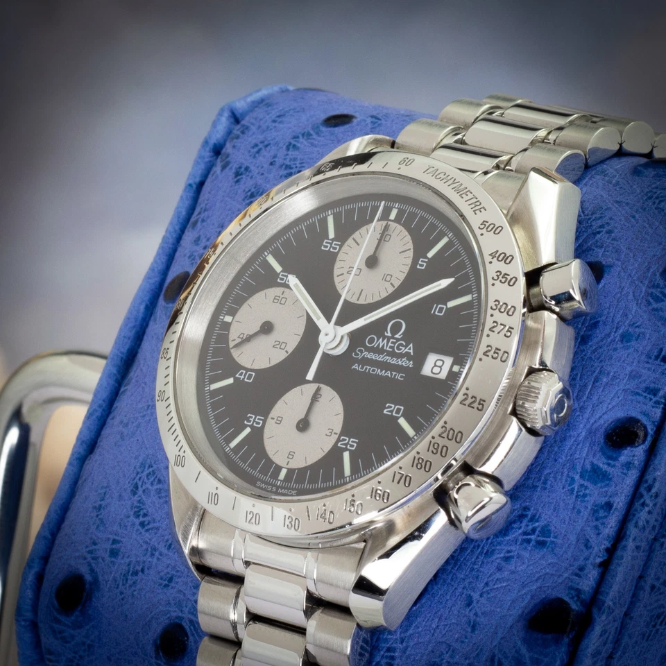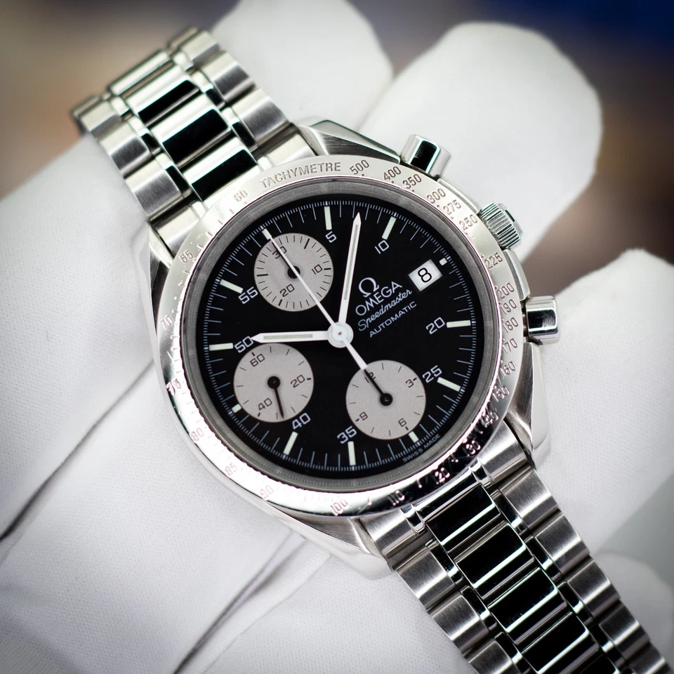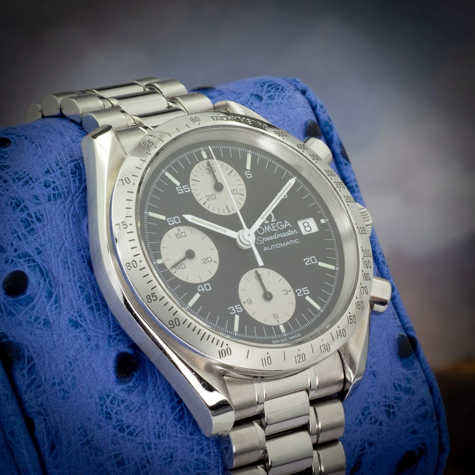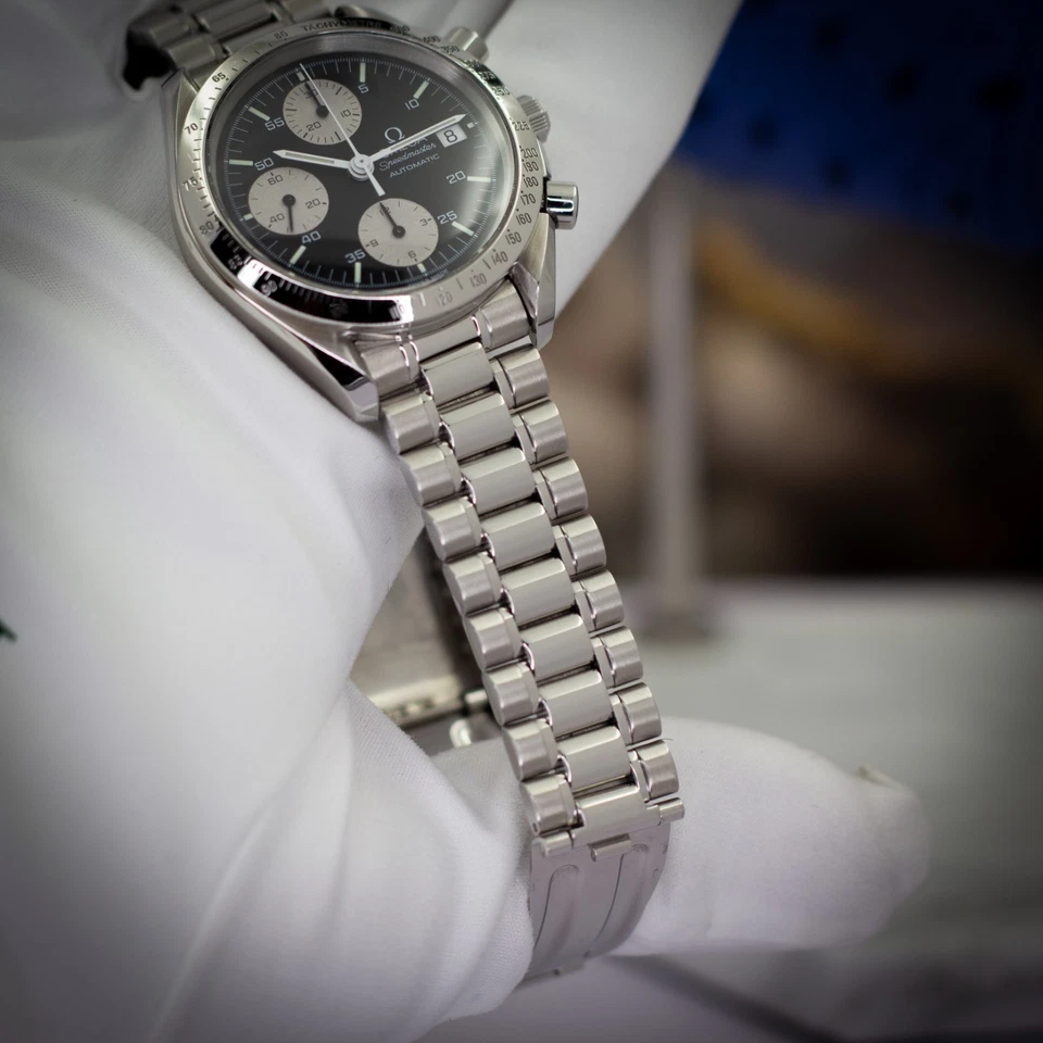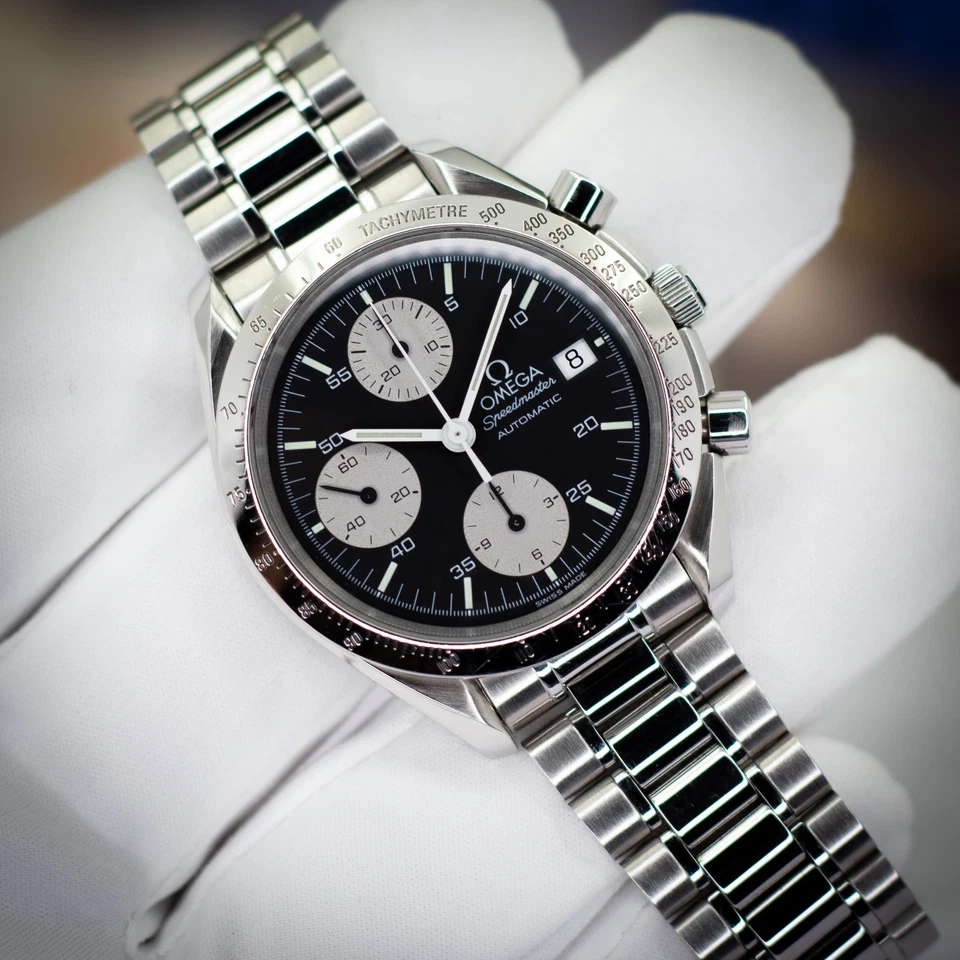 Available is an Omega Speedmaster Automatic, reference 3511.50.00, featuring the striking “Reverse Panda” dial configuration black base with contrasting silver sub-registers and date display at 3 o’clock. Part of the Speedmaster Reduced family, this model combines the hallmark design language of the Moonwatch with compact, everyday versatility in a 39 mm case.