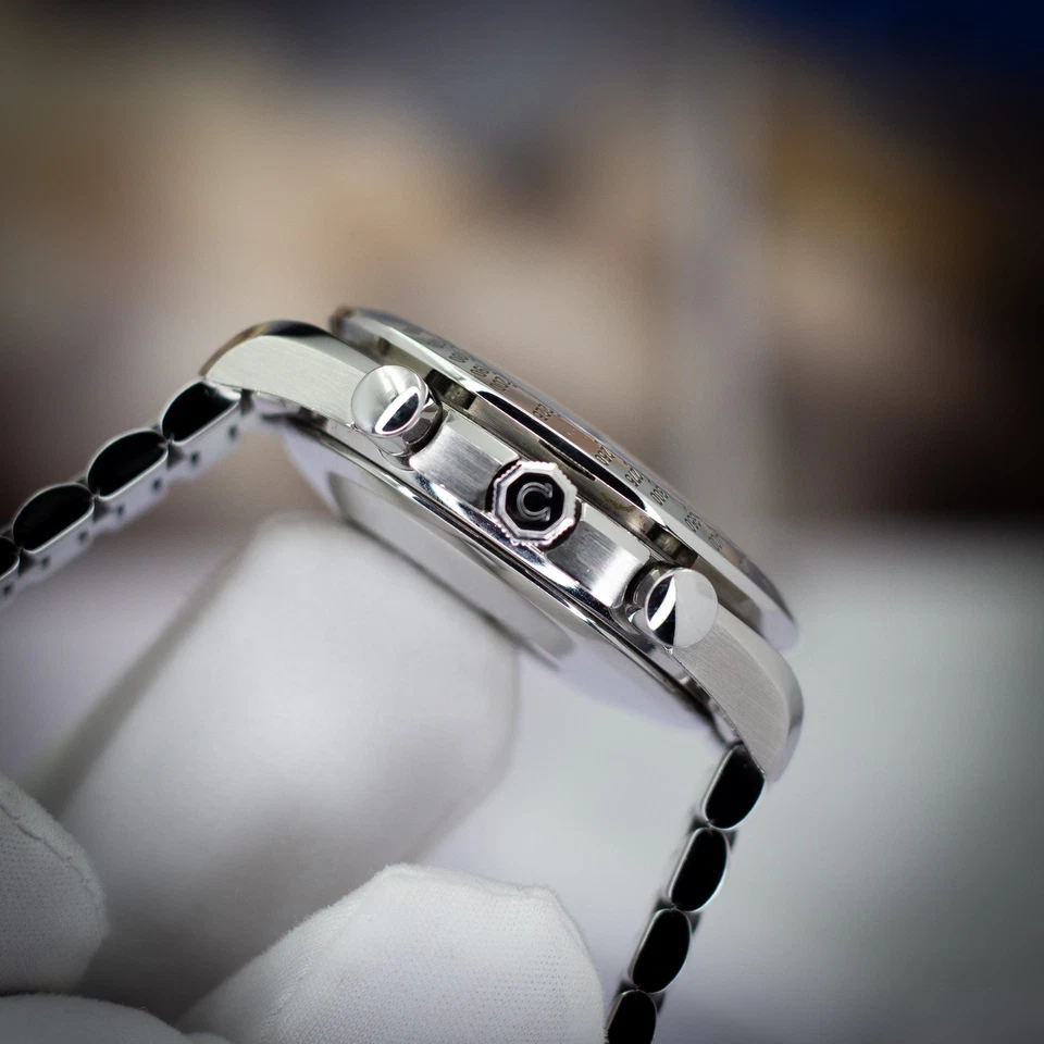 Powered by the Omega Calibre 1152 automatic chronograph movement (ETA 7750 base), the watch delivers smooth timekeeping and precise chronograph performance. This example remains in very good pre-owned condition, showing light wear on the bezel, case, bracelet, and clasp consistent with careful use. The stainless-steel surfaces retain sharp factory geometry and attractive polish throughout. The bracelet is fully linked and comfortably fits wrists up to 7.5 inches.