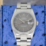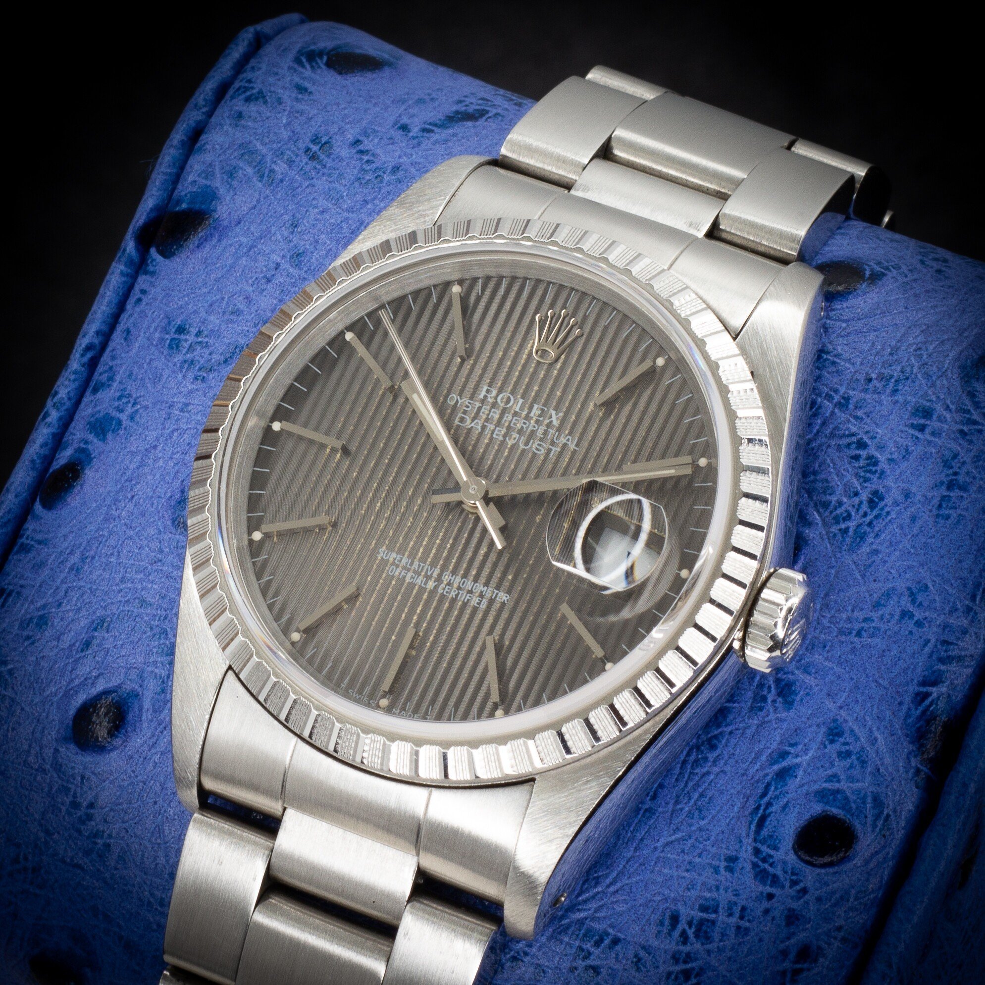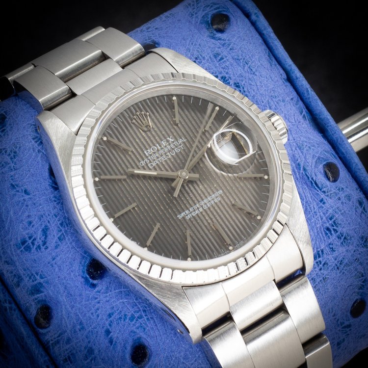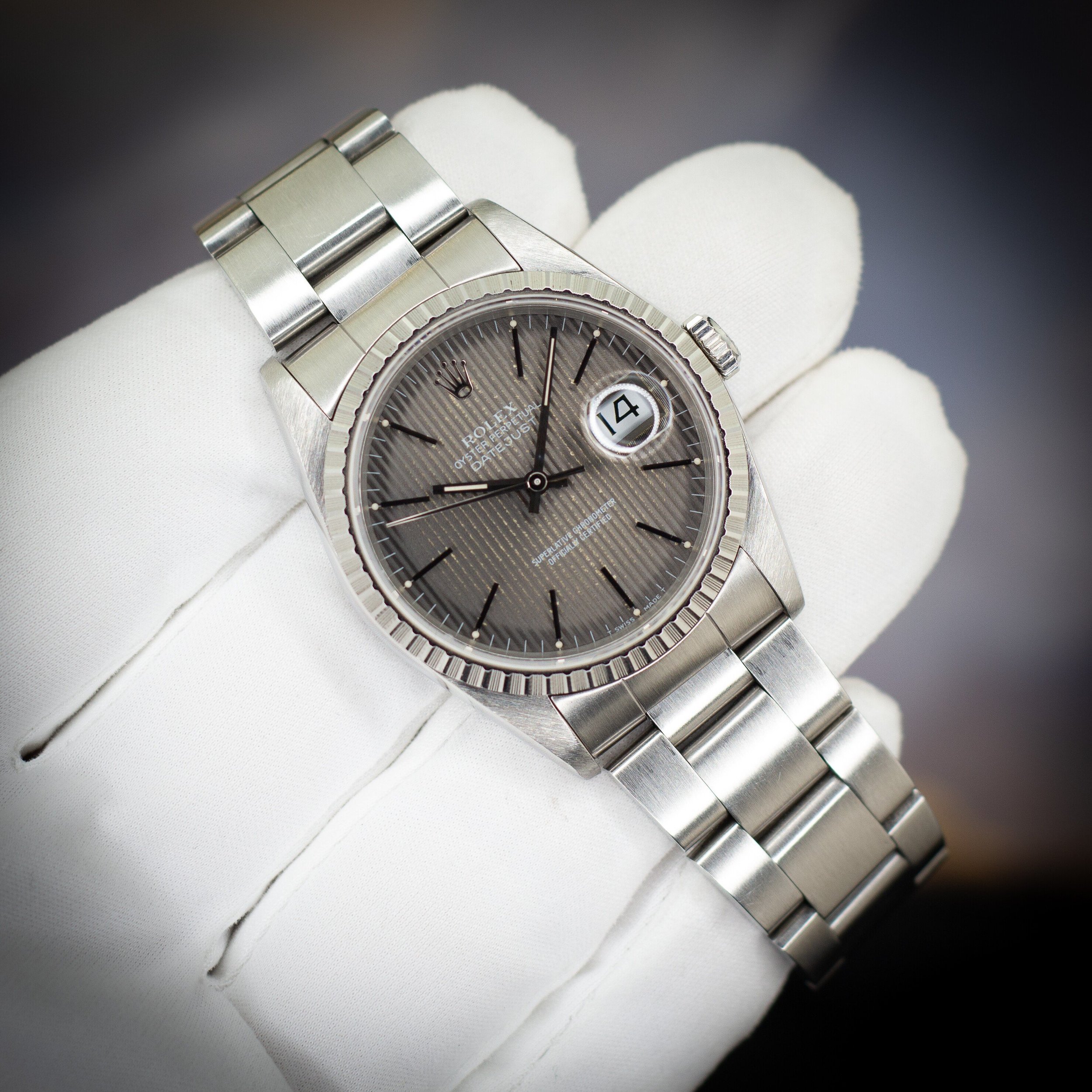 Available for purchase is a Rolex Datejust reference 16200 featuring the rare gray tapestry dial. Produced during the 1990s, this Datejust showcases the refined balance of understated elegance and everyday versatility that has defined the model for decades.
