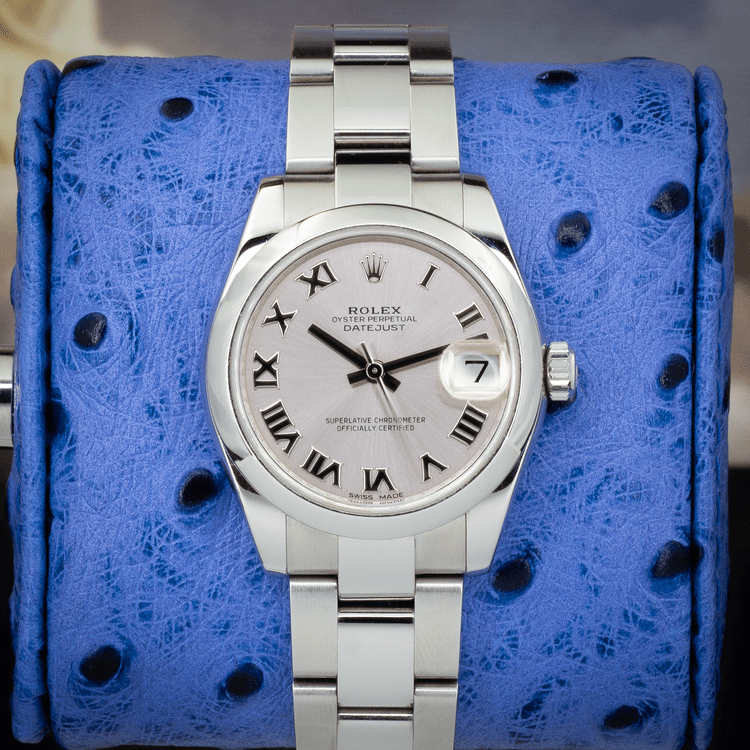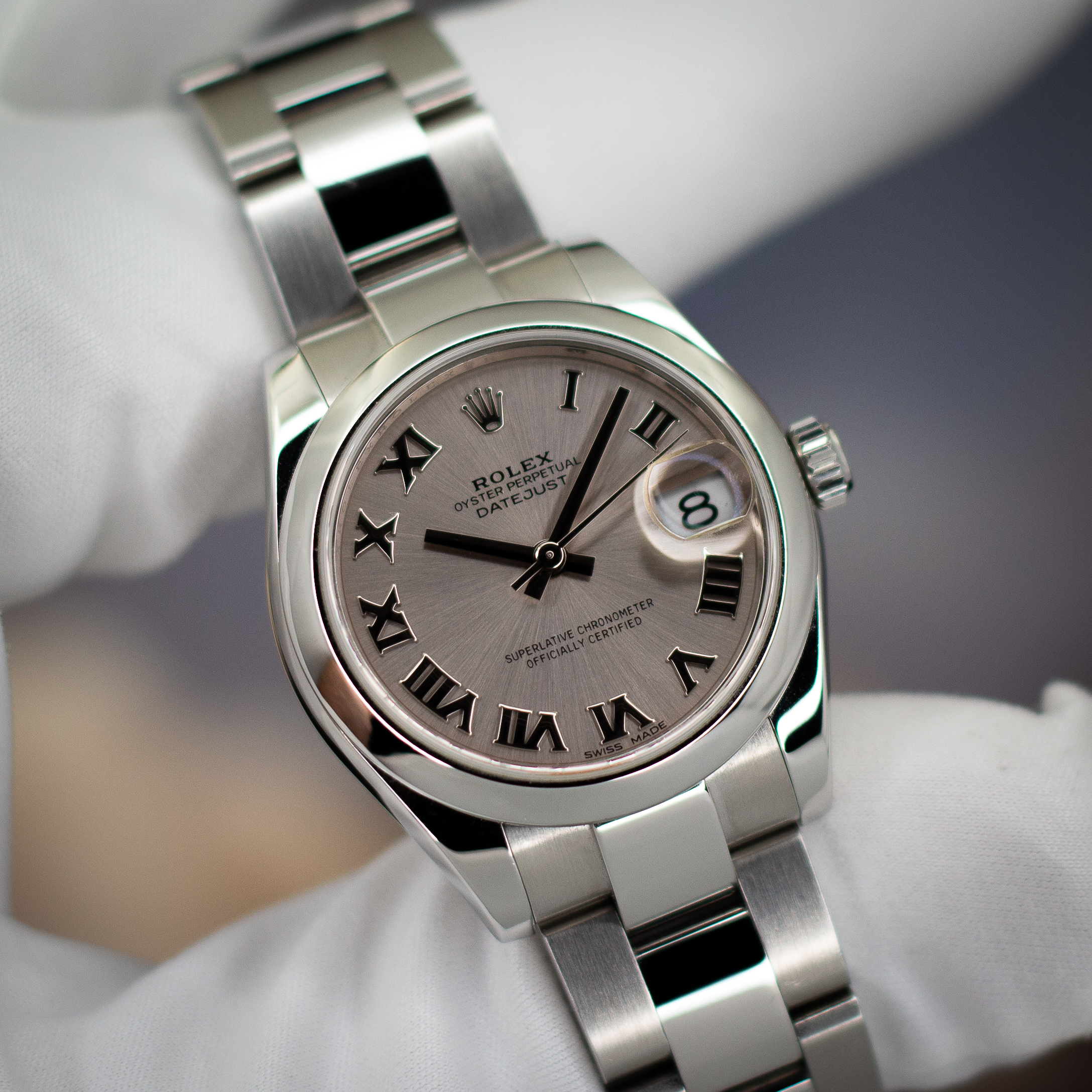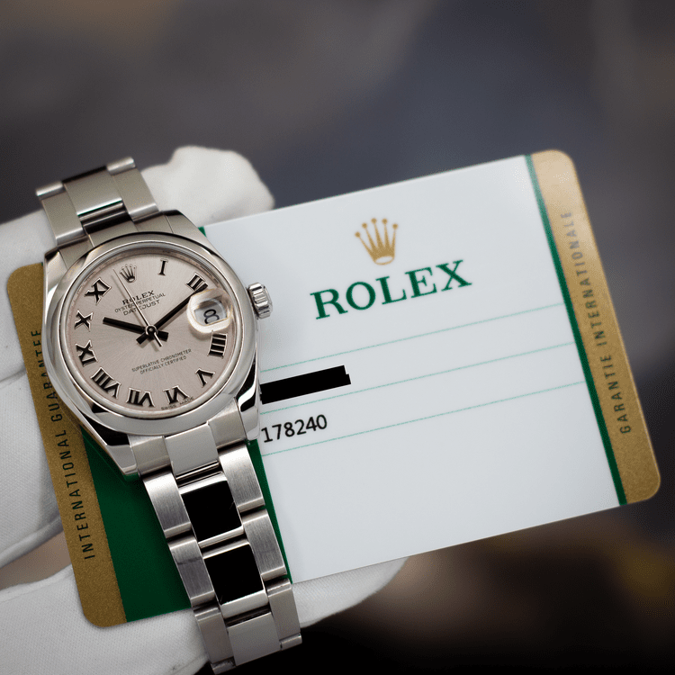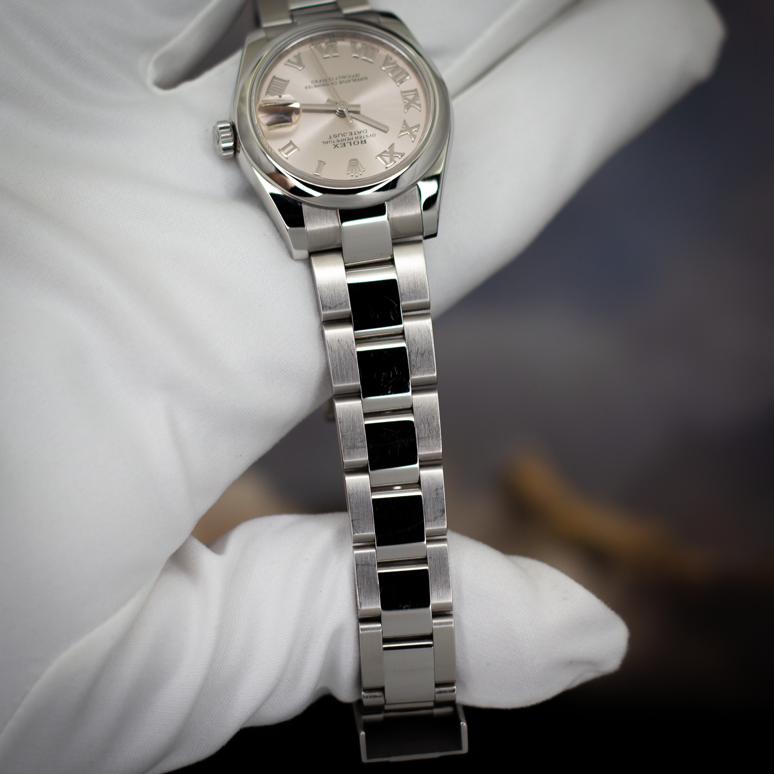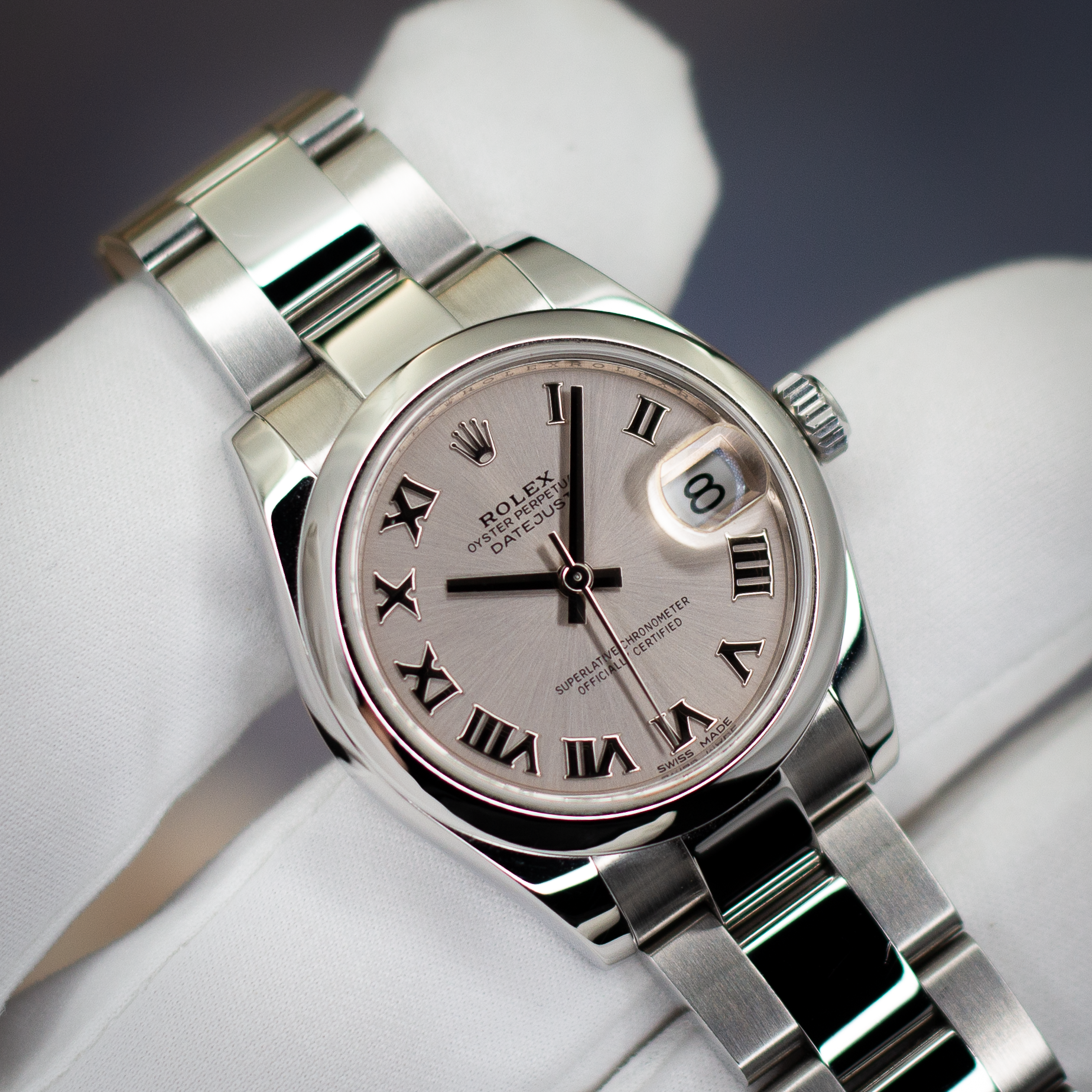 The Rolex Datejust 31 reference 178240 is a refined midsize model that pairs timeless design with everyday practicality. This 2020 example features a 31mm stainless steel Oyster case, smooth polished bezel, and domed sapphire crystal. Its pink dial with applied Roman numerals adds elegance while maintaining the unmistakable Datejust identity.