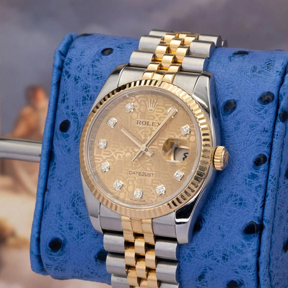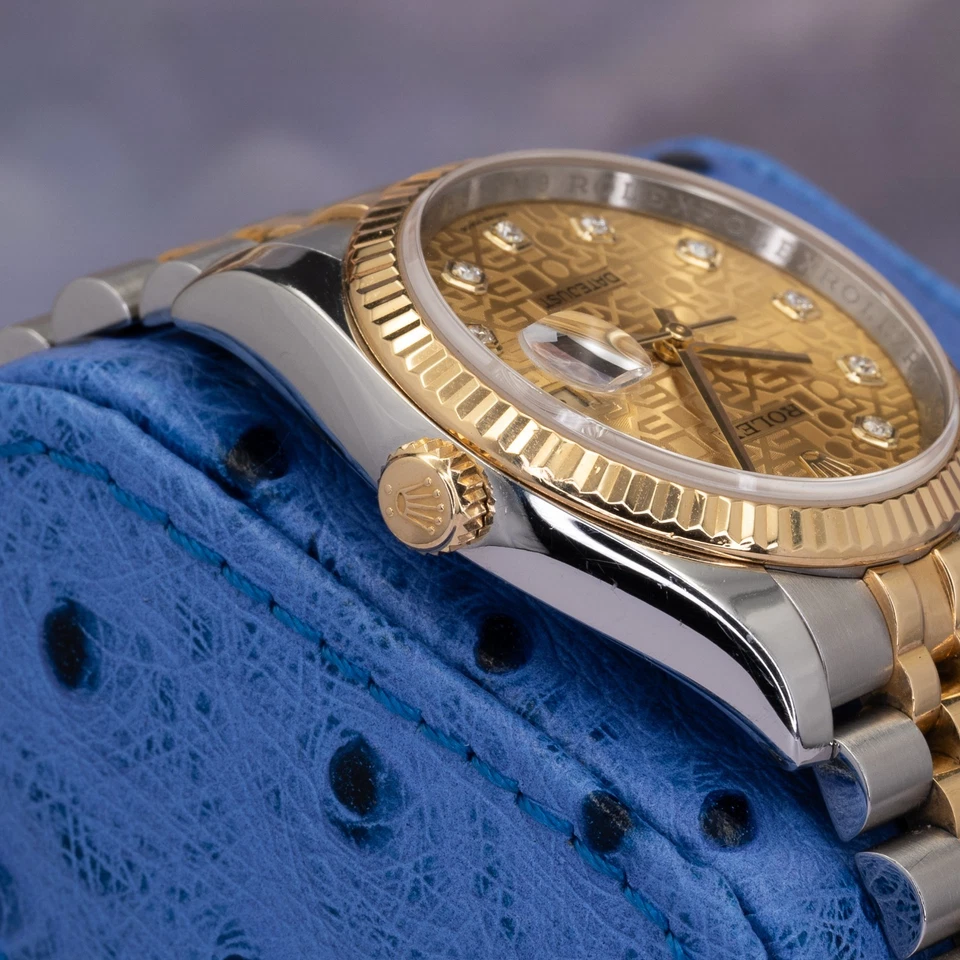 This dial is also known in collector circles as the ROLEX repeating “computer” / jubilee motif adding texture and depth that photographs well and looks even better in person. Diamond hour markers elevate the presentation without sacrificing the Datejust’s core identity: timeless proportions, daily-wear practicality, and unmistakable Rolex presence.