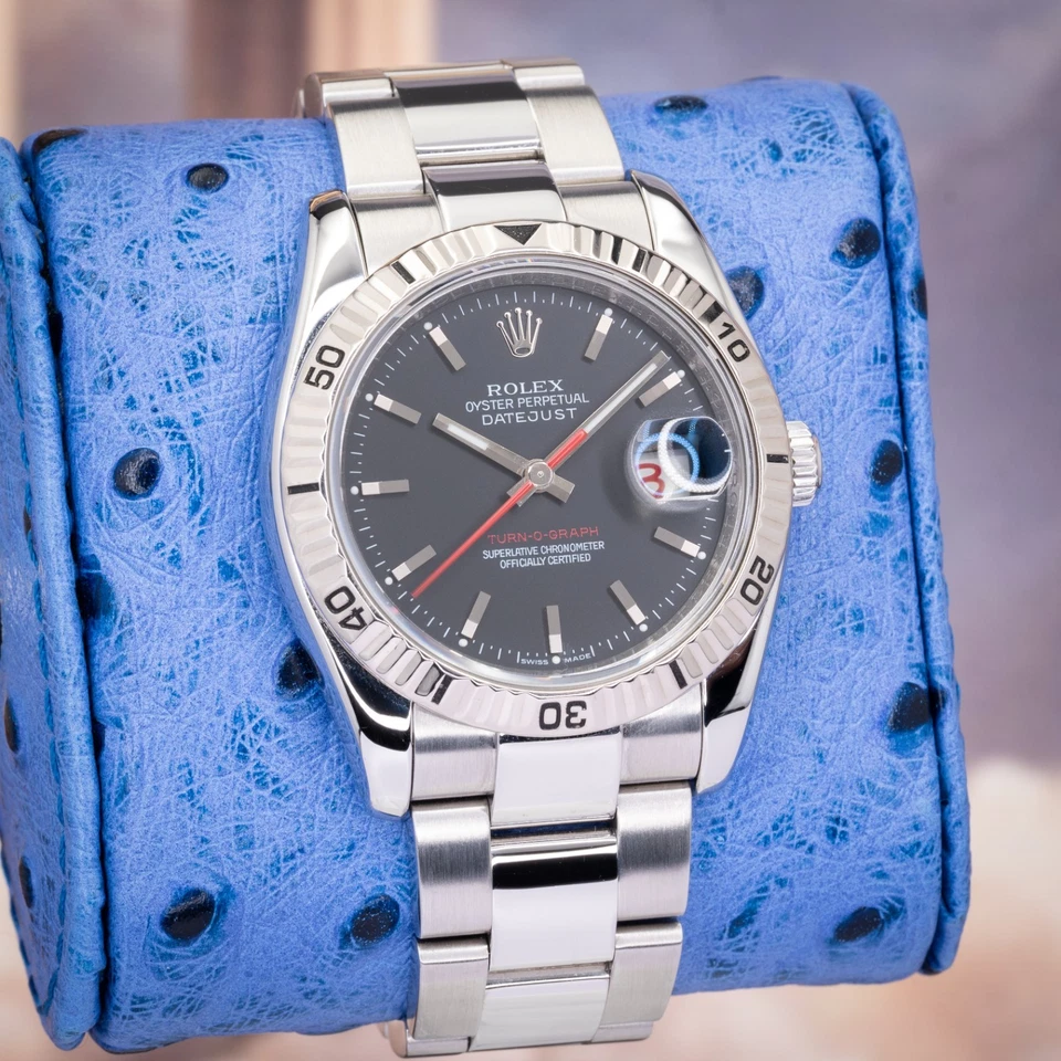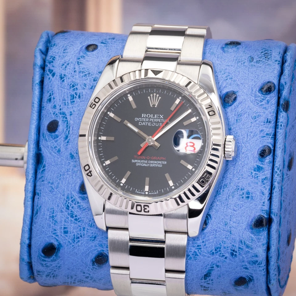 This example features the understated black dial with applied luminous baton hour markers, paired with the signature red seconds hand and red “TURN-O-GRAPH” text details that immediately distinguish the reference from standard Datejust models. The stainless-steel rotating fluted bezel provides practical timing capability while preserving the refined proportions expected of a 36mm Datejust.