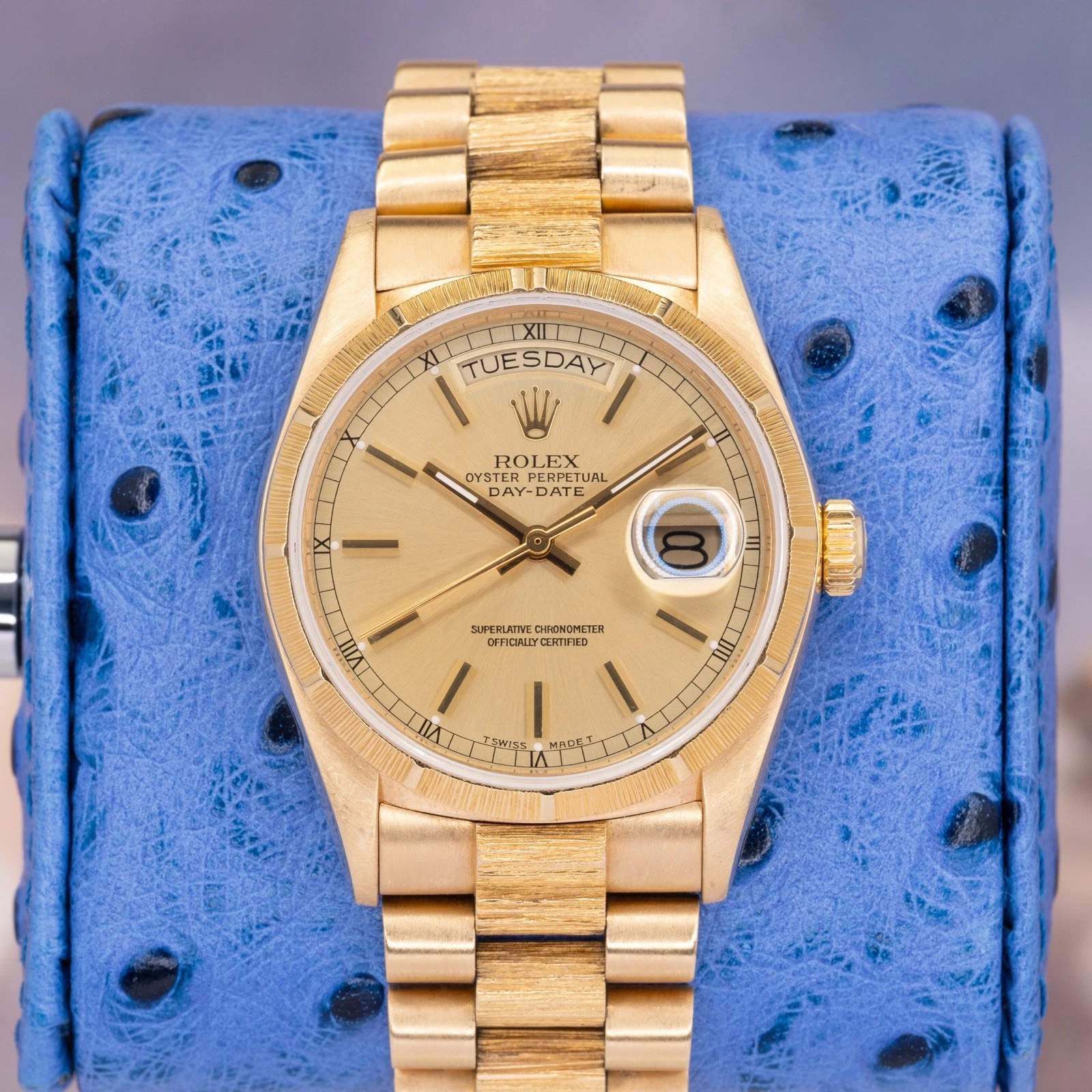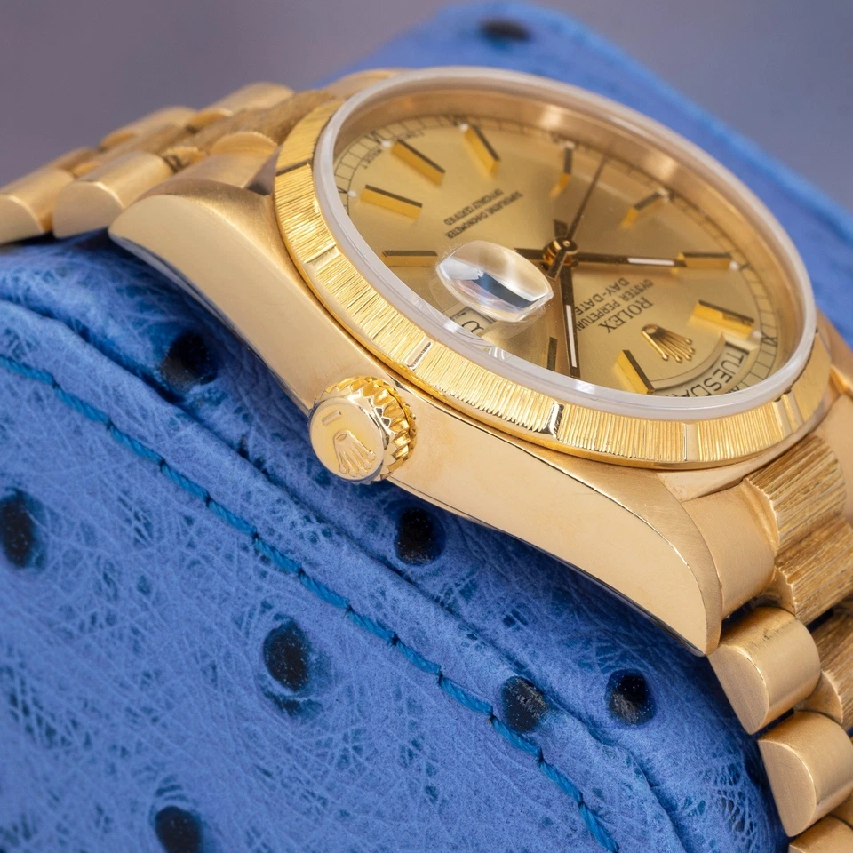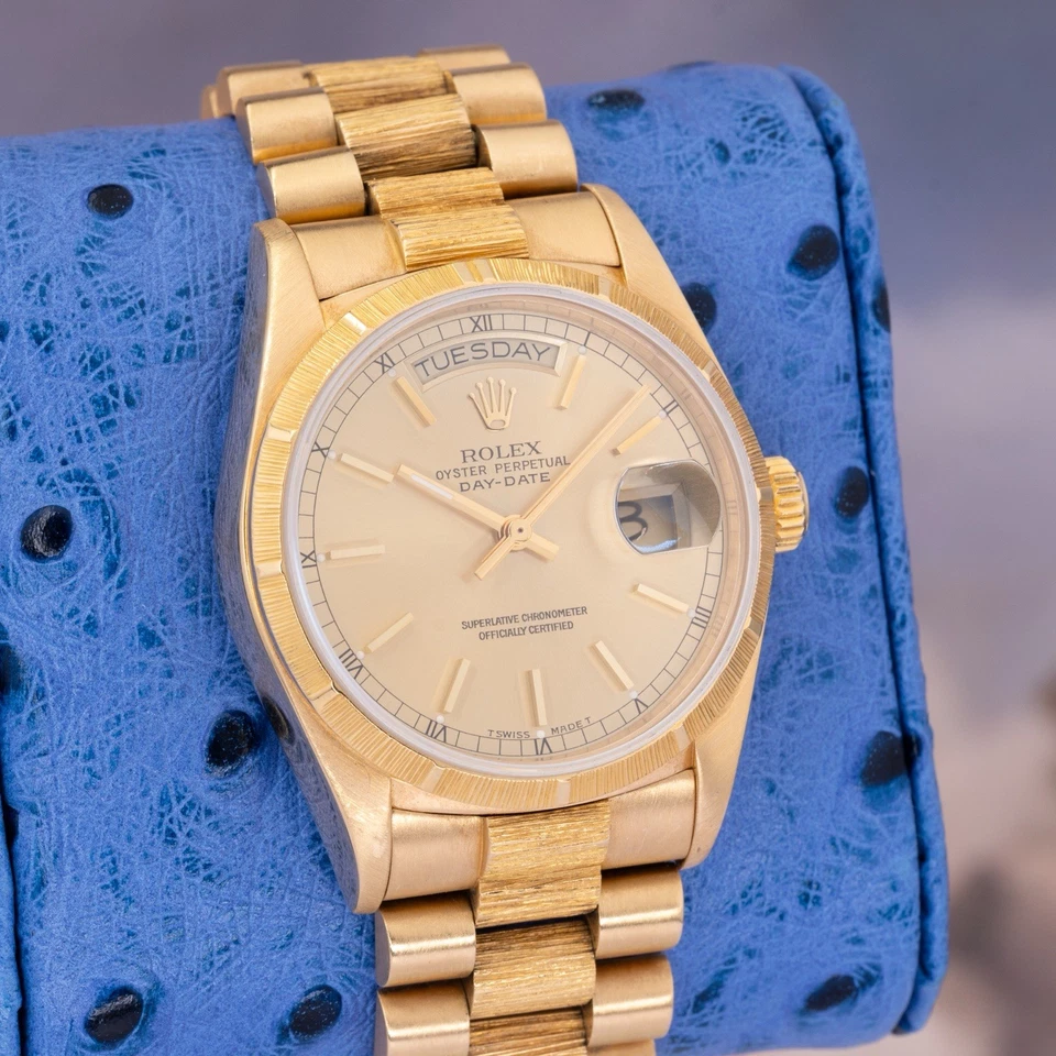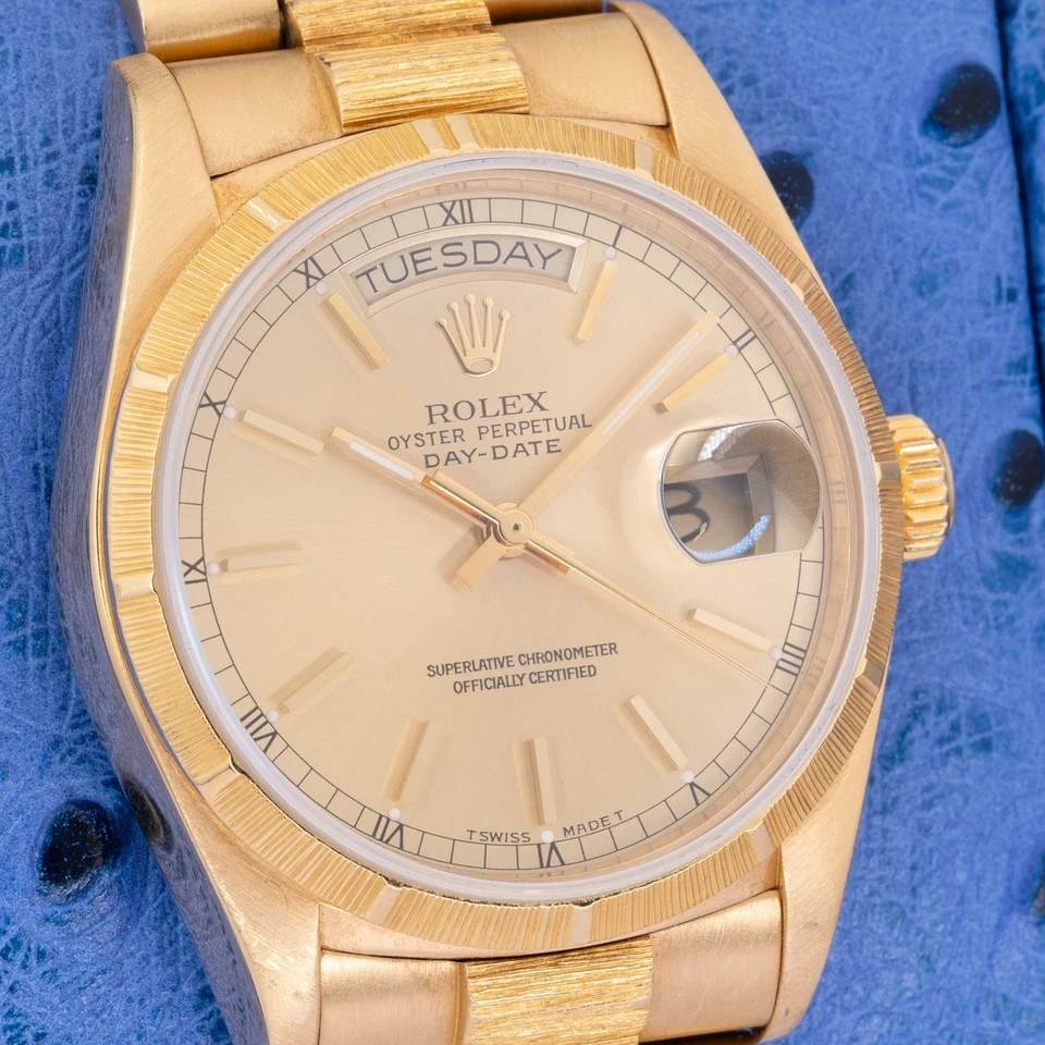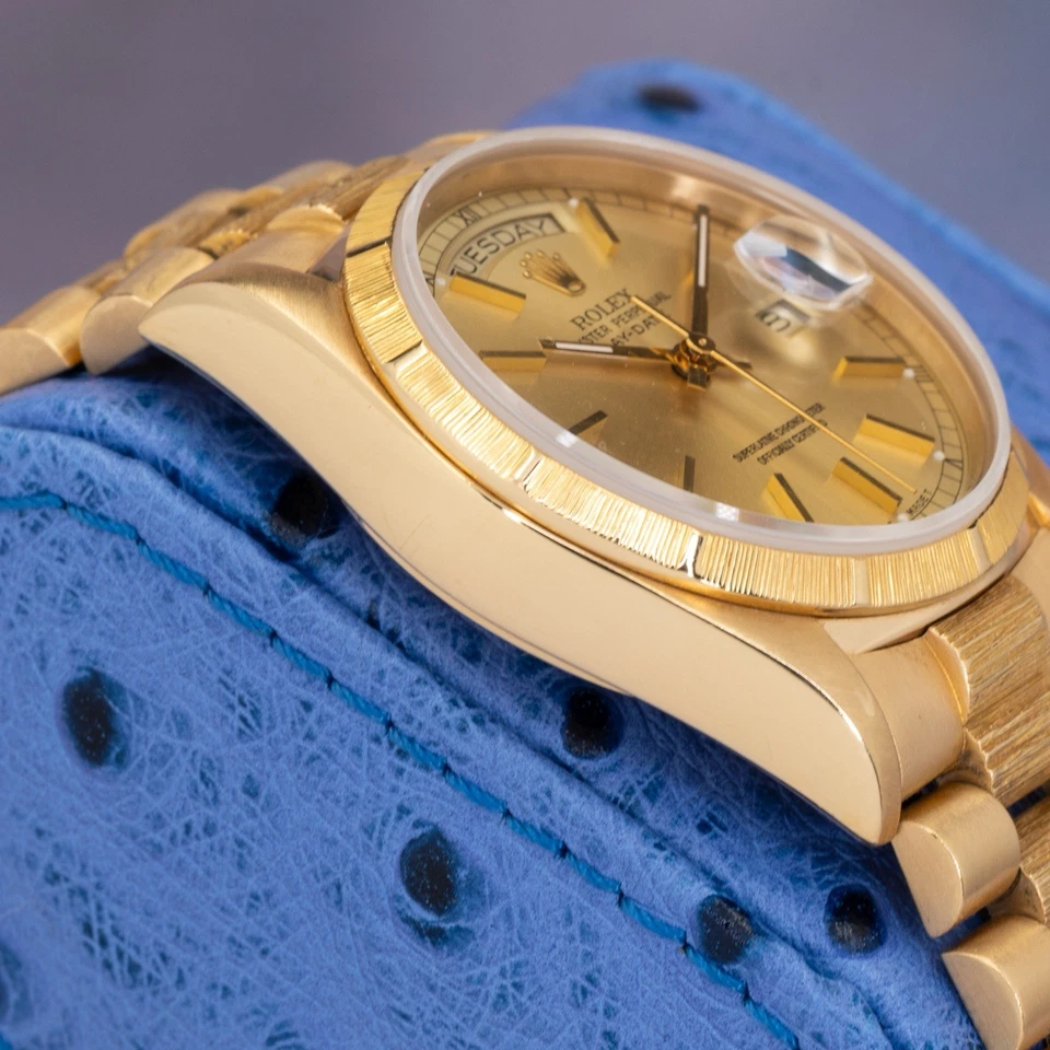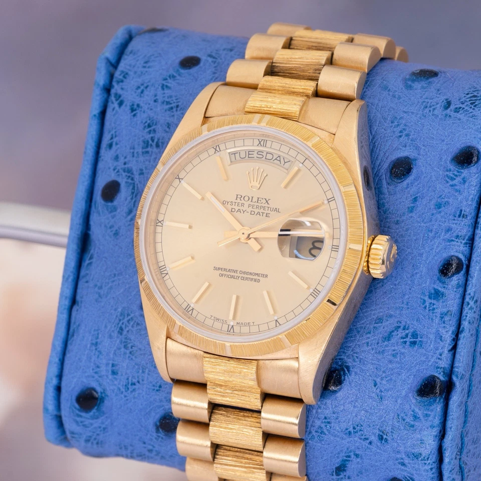 The Bark bezel and matching Bark bracelet center links give this reference its unmistakable identity, adding depth and a tactile, architectural texture that photographs well and looks even better in hand. The champagne dial keeps the watch disciplined and timeless classic Day-Date formality without unnecessary complication.