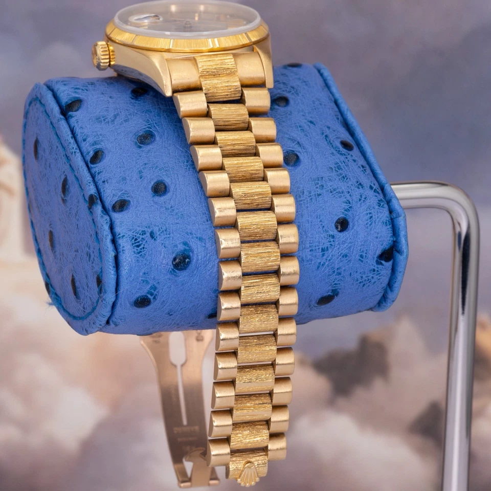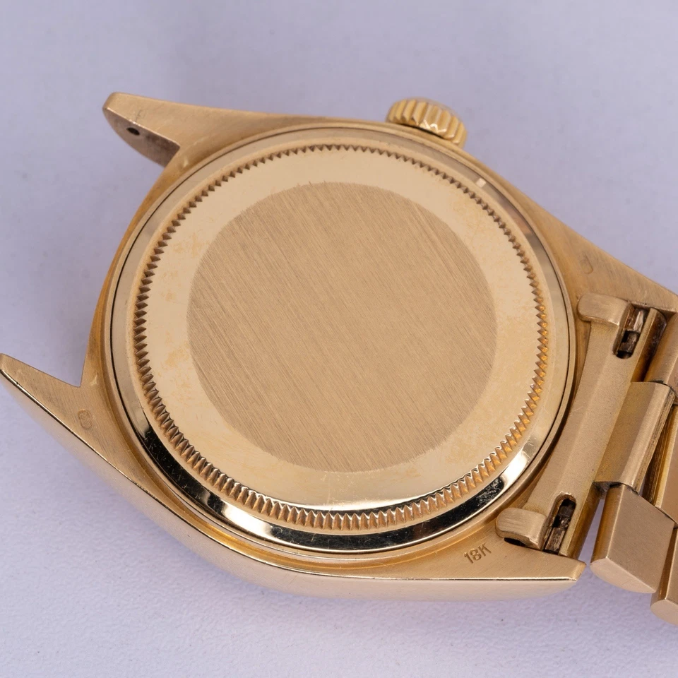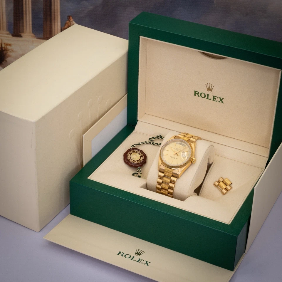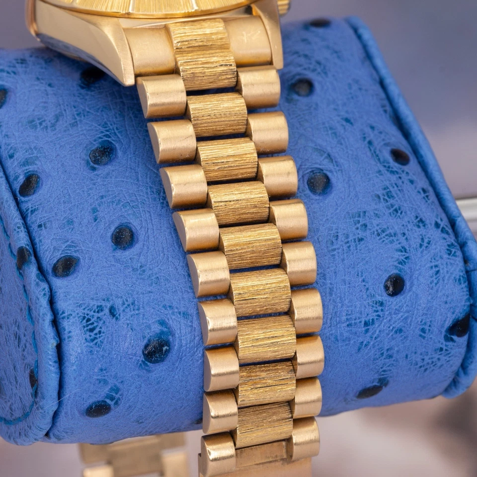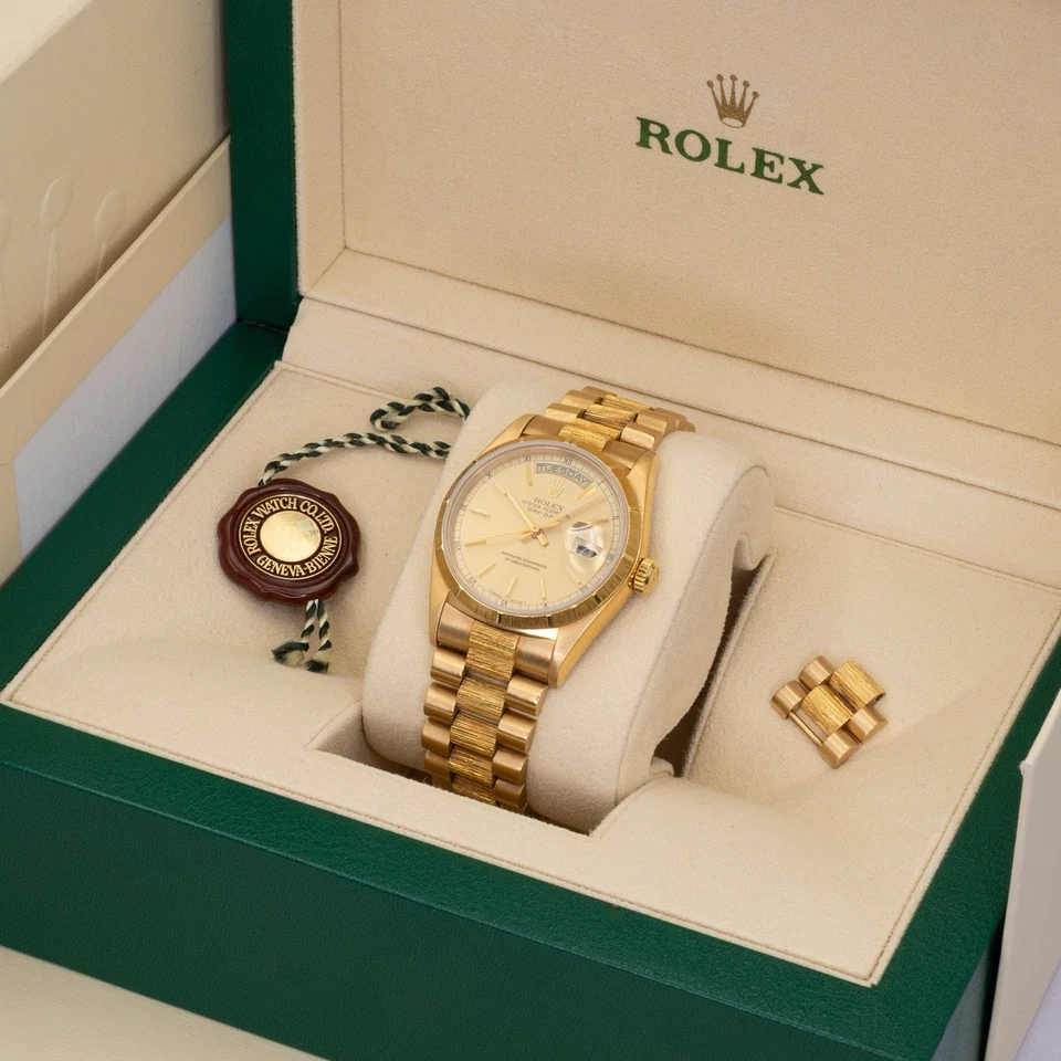 Included with the watch are the Rolex box, hang tag, and full links (23 total), offering excellent sizing flexibility. A correct, wearable vintage President in a configuration collectors actually look for solid gold, Bark texture, and understated authority.