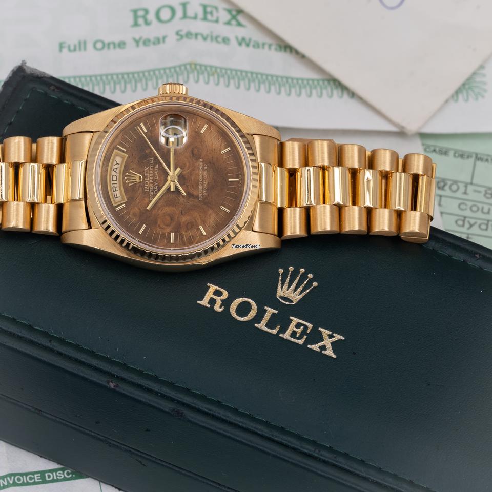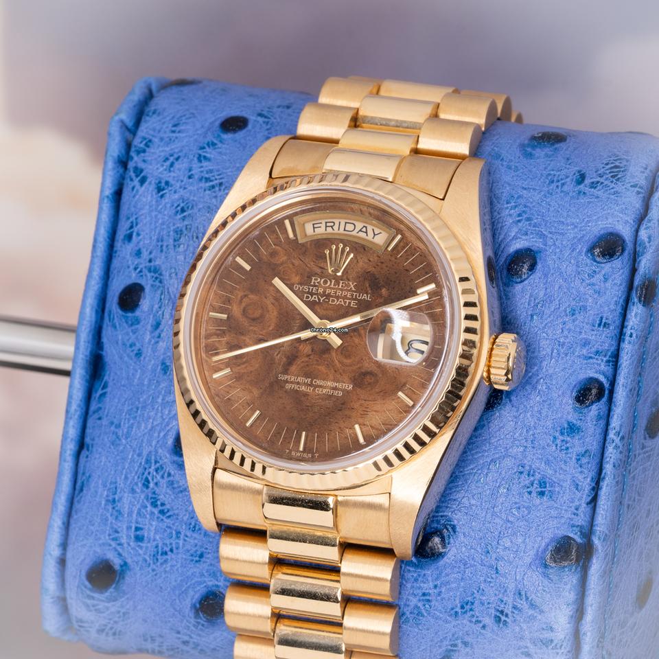 Pre-owned Rolex Day-Date ref. 18038 in 18k yellow gold with a fluted bezel and rare walnut/birch wood dial. 7.2M serial (1982). The wood dial is a natural veneer each example is unique showing rich burl figuring that shifts under light and gives the classic “President” profile a far more uncommon, period-correct character than a standard champagne dial.