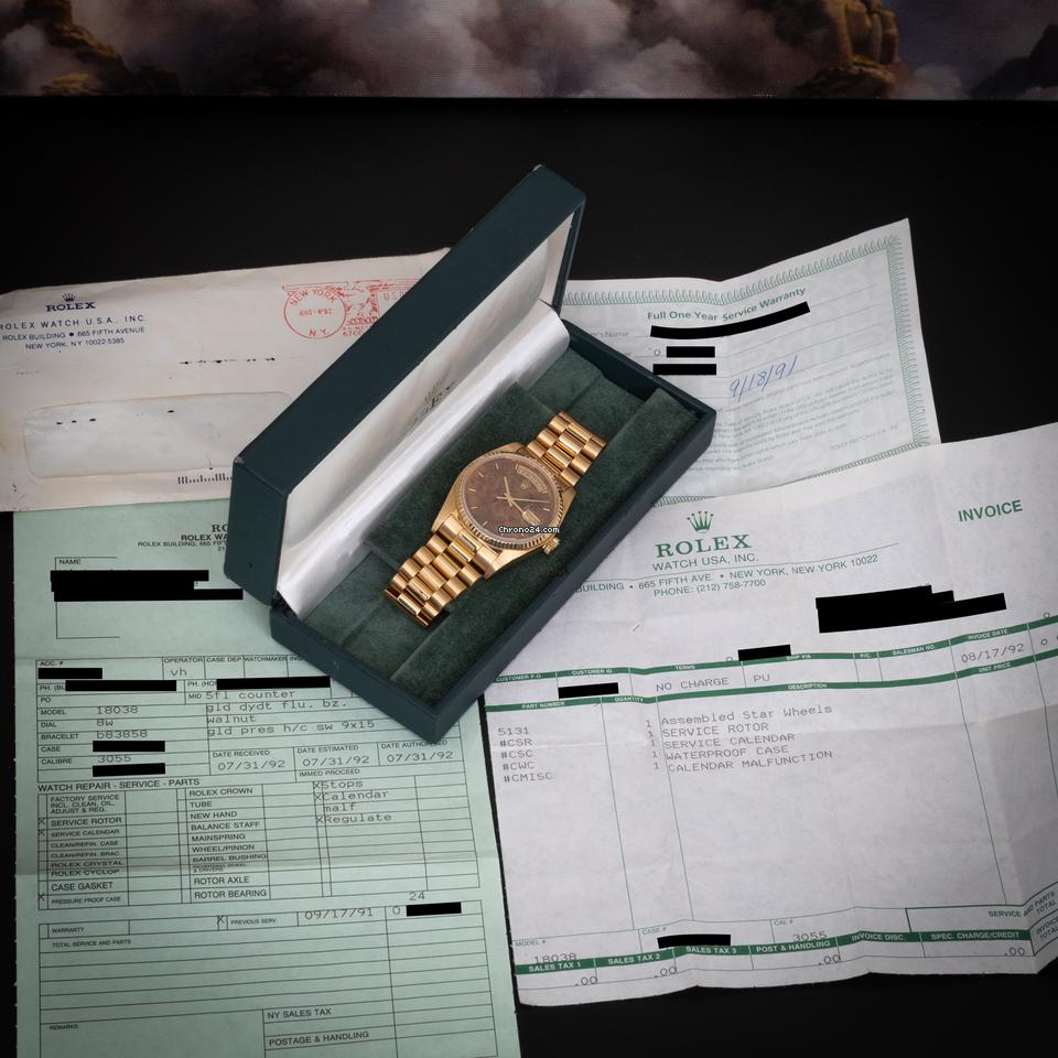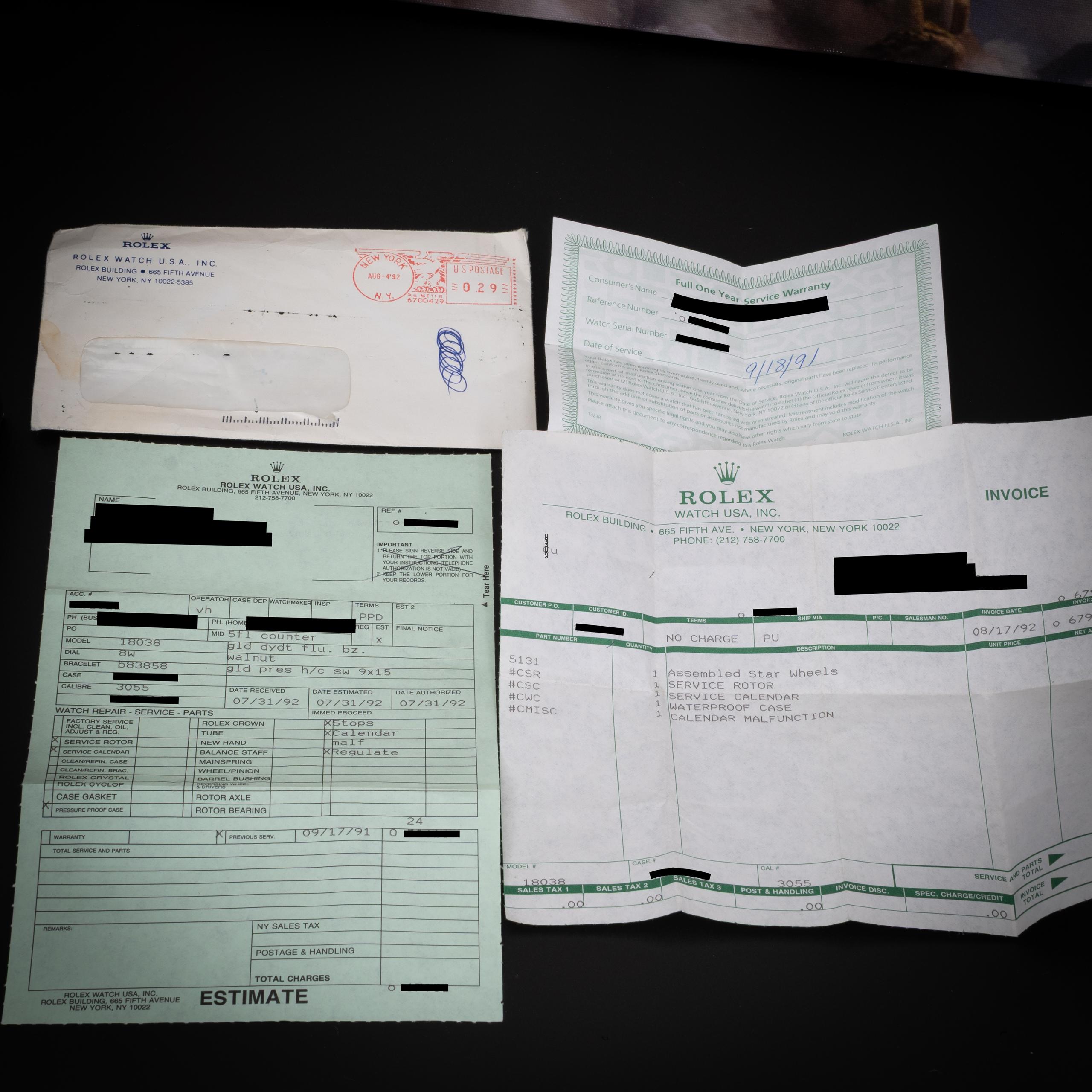 Includes: Rolex Service box and Rolex USA service paperwork dated 1991 and 1992 (service invoices/warranty documents shown in the photos).