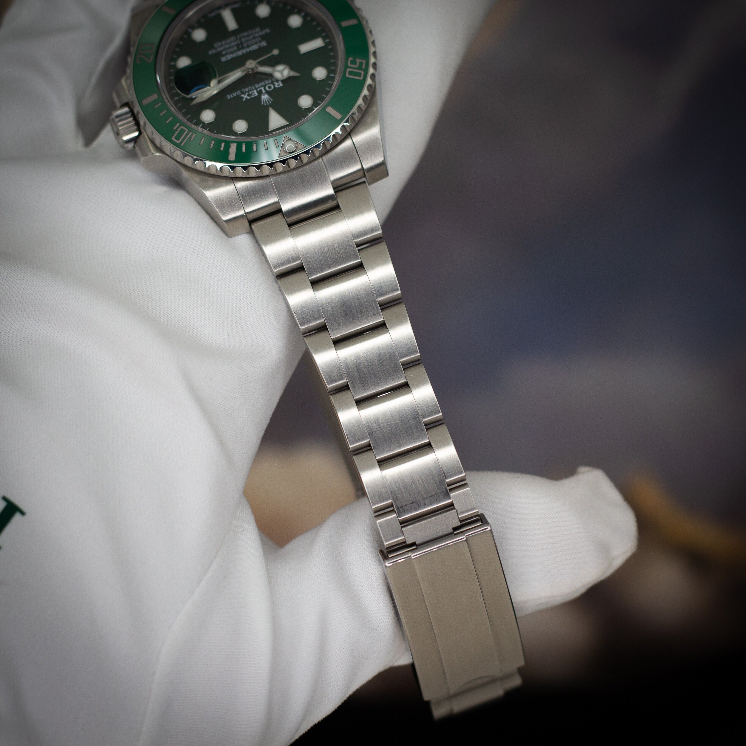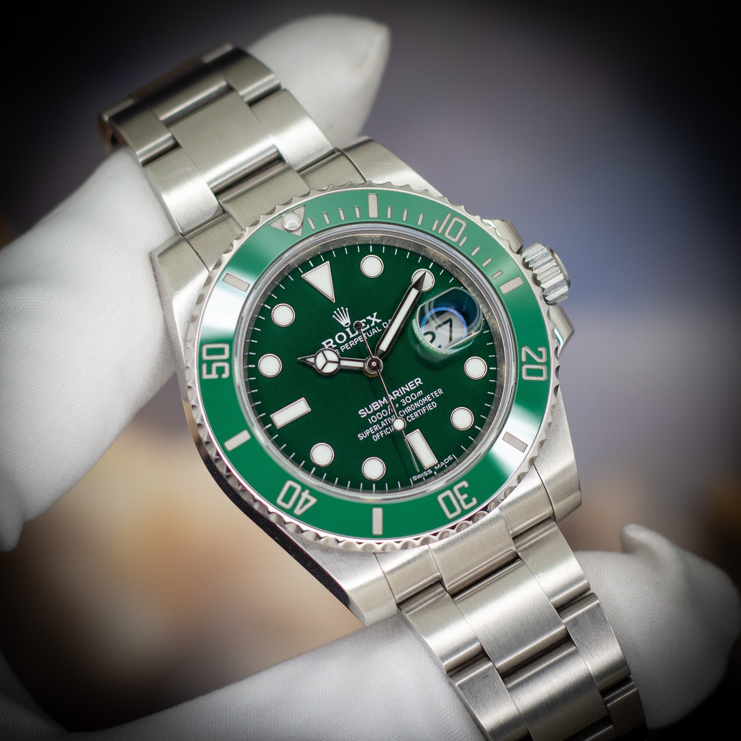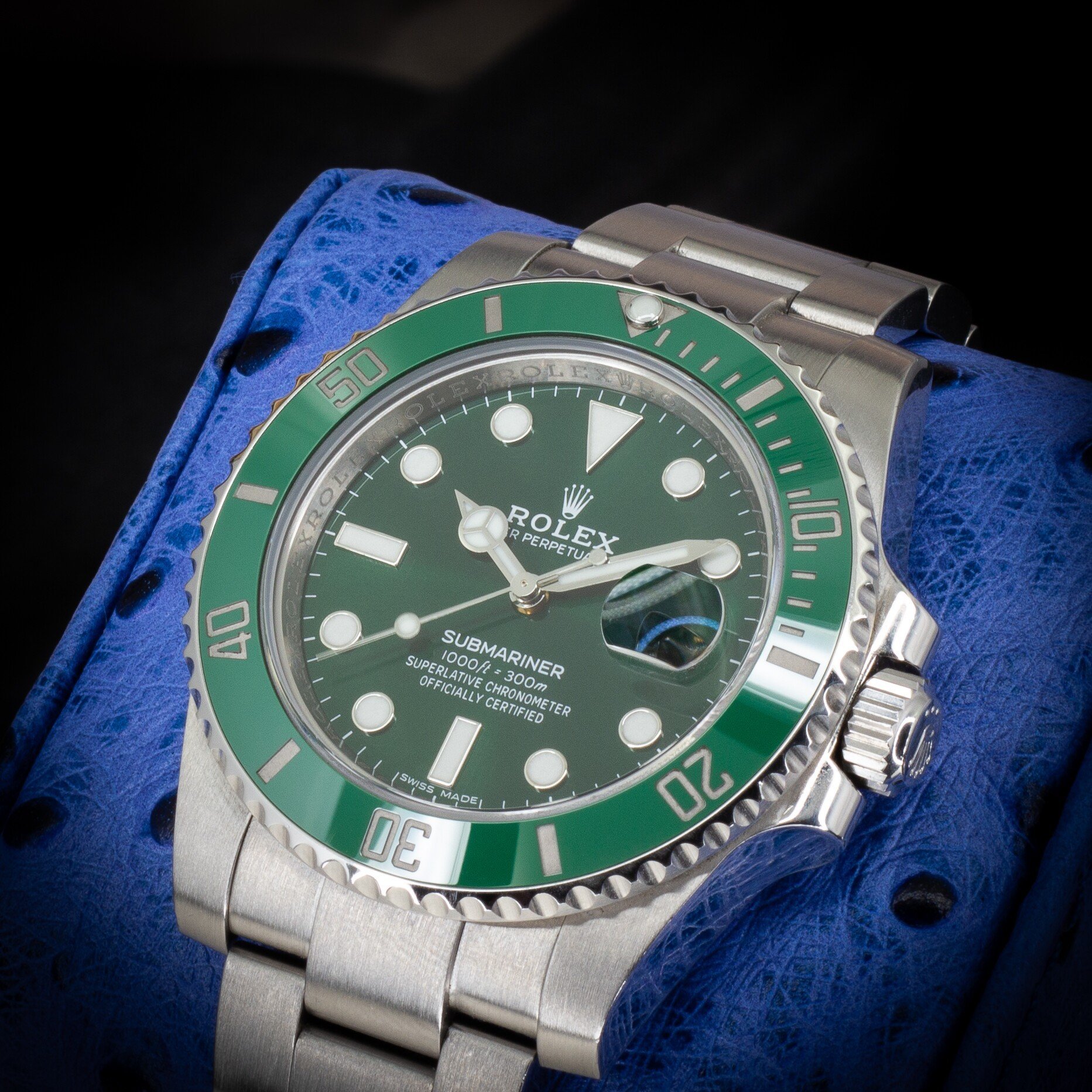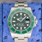 Available for purchase is the highly collectible Rolex Submariner 116610LV “Hulk”, featuring its iconic green dial and matching green ceramic bezel. Introduced in 2010, the Hulk quickly became one of the most sought-after modern Submariners, discontinued in 2020 and now a staple among Rolex collectors.