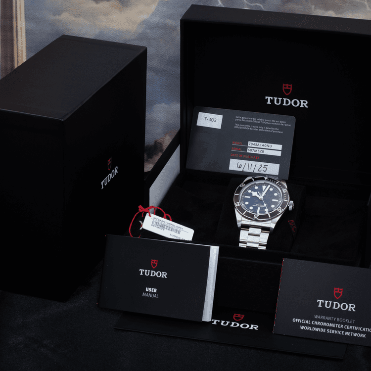 The sun-brushed TUDOR Blue dial contrasts beautifully with the matte black aluminum bezel insert. The bracelet features polished and satin finishes with Tudor’s T-fit clasp, offering on-the-fly microadjustment. This example is brand new, unworn, fully stickered, and comes complete with everything as delivered by the authorized dealer. Warranty card is dated June 11, 2025.